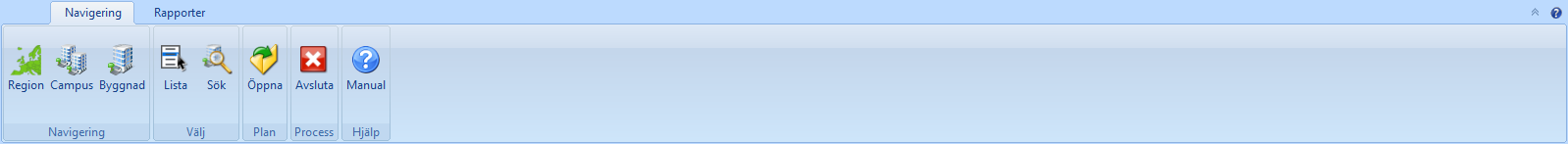 När du arbetar under navigeringsfliken kan du se att panelen innehåller fem kategorier – Navigering, Välj, Plan, Process och Hjälp. Kategorierna innehåller i sin tur sammanlagt åtta knappar som du kan använda dig av när du arbetar på processens öppningssida, närmare bestämt knapparna Region, Campus, Byggnad, Lista, Sök, Öppna, Avsluta och Manual (se bilden nedan).