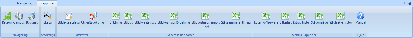 När du arbetar under rapportfliken kan du se att panelen innehåller sex kategorier – Navigering, Städkalkyl, Utskrifter, Generella rapporter, Specifika rapporter och Hjälp. Kategorierna innehåller i sin tur sammanlagt arton knappar som du kan använda dig av när du arbetar på processens öppningssida, närmare bestämt knapparna Navigering, Campus, Byggnad, Städkalkyl, Städavtalsbilaga, Utskriftsdokument, Städning, Städtid, Städkvalitetstyp, Städkostnadsfördelning, Städkostnadsrapport (typ) Städsammanställning, Lokaltyp/frekvens, Säkerhet, Extratjänster, Städområden, Städfrekvensytor och Manual (se bilden nedan).