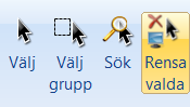 Observera! Placera-knappen och Sätt-knappen kan inte vara aktiverade samtidigt. Om Sätt-knappen är aktiverad är Placera-knappen inaktiverad. Om Sätt-knappen är aktiverad kan du alltså inte använda Placera-knappen. Sätt-knappen aktiveras om du valt ett eller fler rum i modellen. För att inaktivera Sätt-knappen klickar du på knappen Rensa valda i Rum-kategorin (se bilden nedan). När du klickar på Rensa valda kommer alla valda rum väljas av så inget rum är valt och Placera-knappen kommer då aktiveras.
