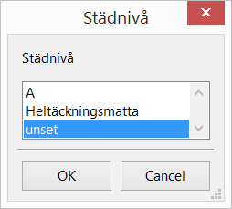 4. avsluta med att klicka OK i botten av dialogrutan – du har nu tagit bort den satta städnivå från det rum vars städinformationsmeny du valt att visa och du kommer nu kunna se texten "unset" i informationsraden "Nivå" (se bilden nedan).