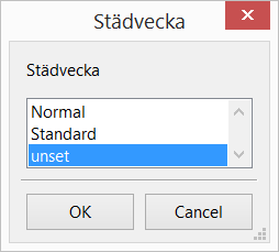 4. avsluta med att klicka OK i botten av dialogrutan – du har nu tagit bort den satta städveckan från det rum vars städinformationsmeny du valt att visa och du kommer nu kunna se texten "unset"  i informationsraden "Städvecka" (se bilden nedan).
