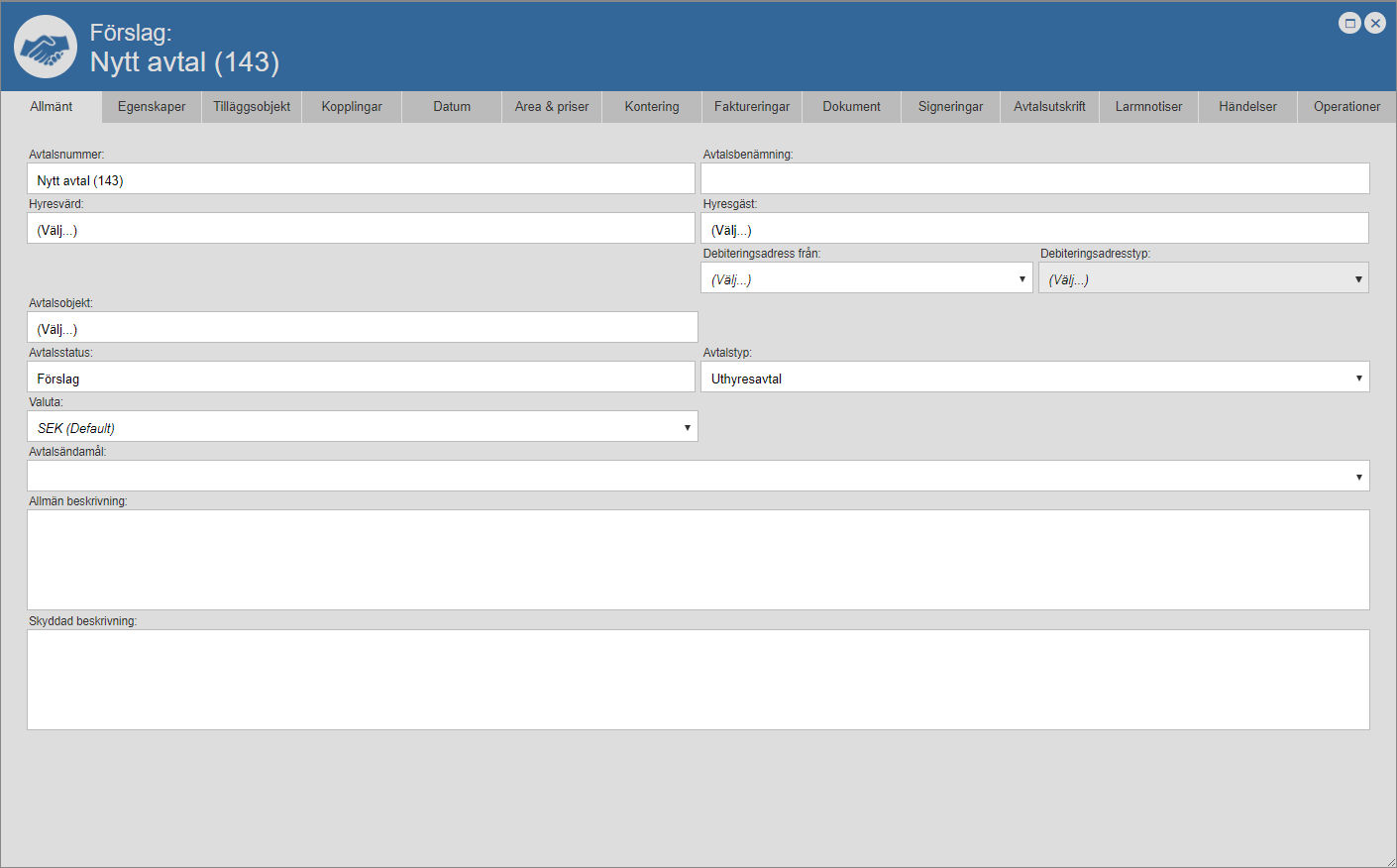 När du står på fliken med namnet "Allmänt" har du möjlighet att se, granska, lägga till och redigera den allmänna information som är satt på det avtal du arbetar med. Detta via fälten med namnen: "Avtalsnummer", "Avtalsbenämning", "Hyresvärd", "Hyresgäst", "Debiteringsadress från", "Debiteringsadresstyp", "Avtalsobjekt", "Avtalsstatus", "Avtalstyp", "Valuta", "Avtalsändamål", "Allmän beskrivning" och "Skyddad beskrivning" (se bilden nedan). Obs! Du kanske inte har tillgång till alla fält som är satta som standard under fliken med namnet "Allmänt". Detta eftersom det är den eller de som är satta som administratörer i din organisation som bestämmer vilka fält du och dina kollegor ska ha tillgång till när ni står på fliken med namnet "Allmänt". Om du saknar något eller några av de fält vi beskriver i detta avsnitt och dess underavsnitt är det för att den eller de som är satta som administratörer i din organisation har bestämt att du och dina kollegor inte ska ha tillgång till fälten. Detta eftersom ni inte har någon nytta av dem.