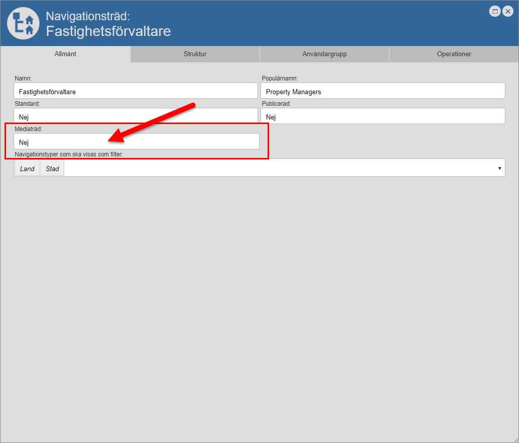 "Publicerad", "Mediaträd" och "Navigationstyper som ska visas som filter" (se bilden nedan).