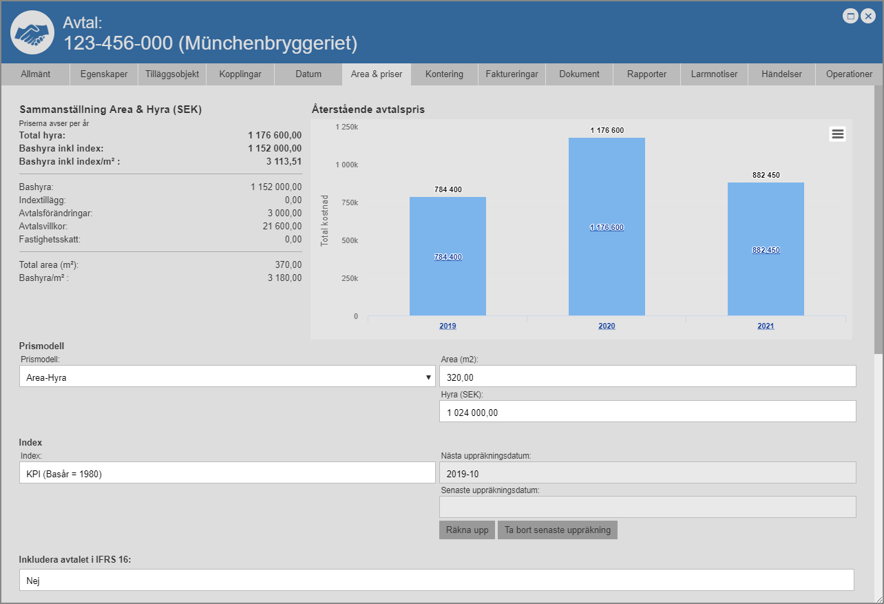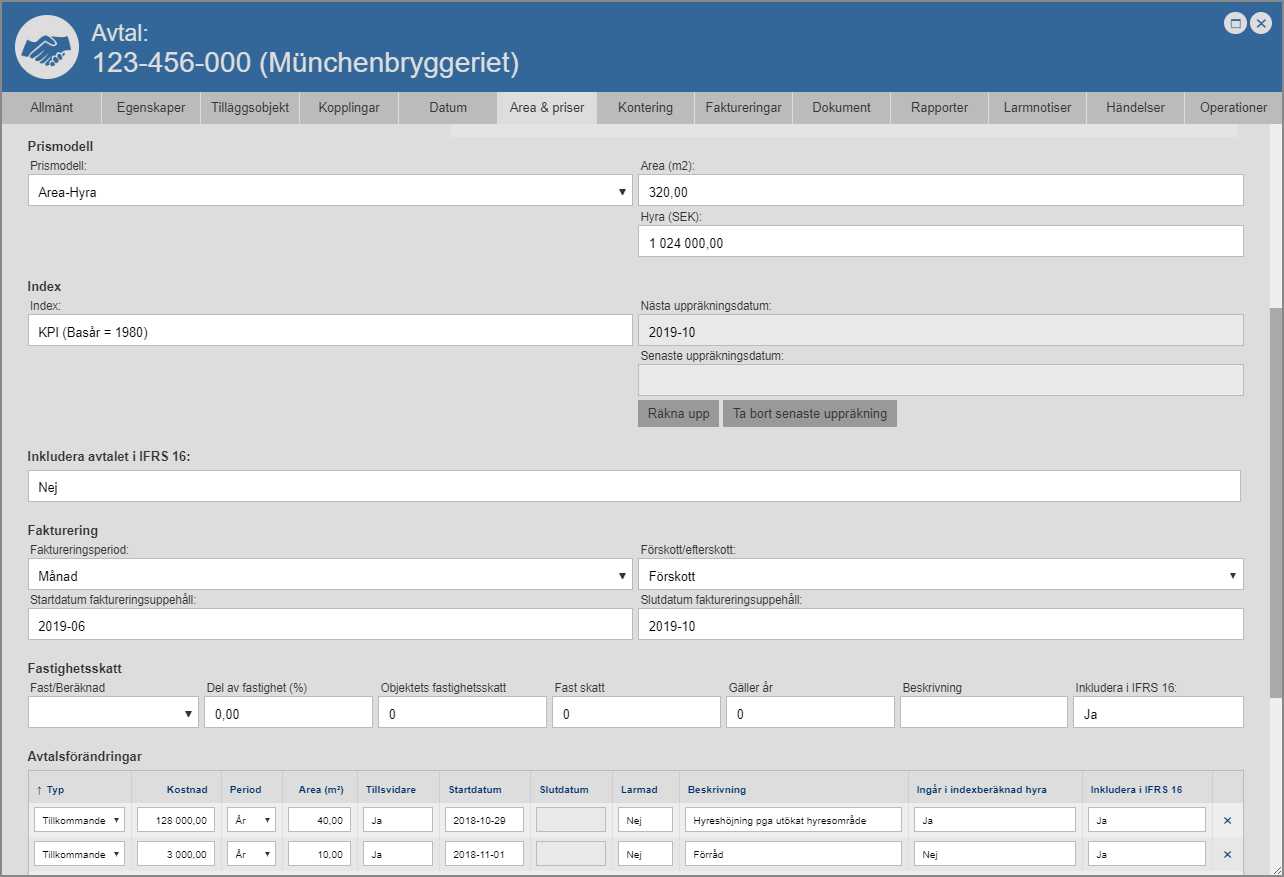När du står på fliken med namnet "Area & priser" har du inte bara tillgång till rubrikerna "Sammanställning Area & Hyra" och "Återstående avtalspris". När du står på fliken med namnet "Area & priser" har du även tillgång till följande rubriker: "Prismodell","Index", "Inkludera avtalet i IFRS 16", "Fakturering", "Fastighetsskatt", "Avtalsförändringar", "Avtalsvillkor" och "Förändringsoptioner" (se bilderna nedan).
