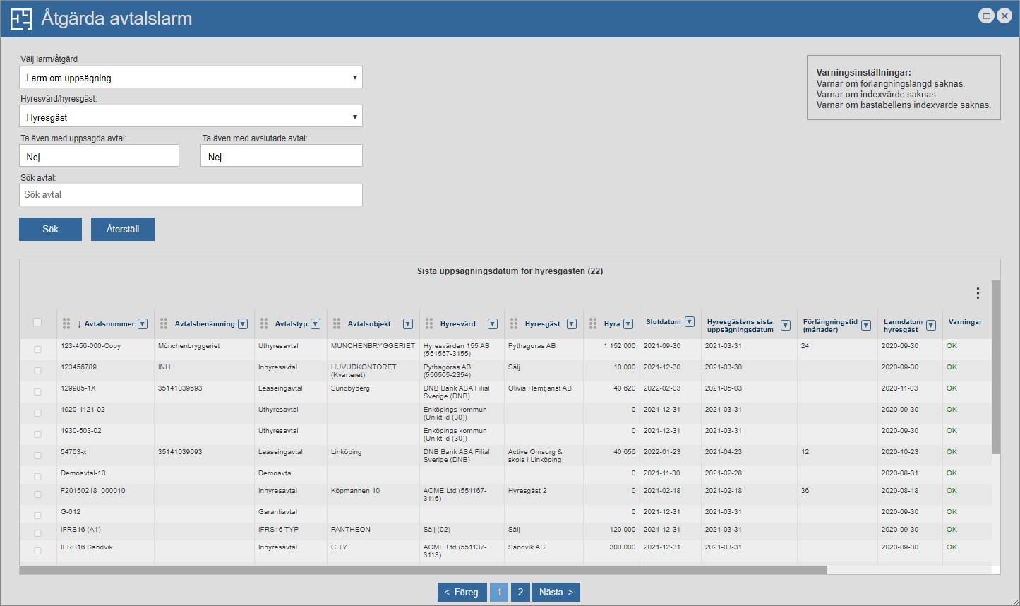 Via larmkortet har du också möjliget att skapa dig en överblick över de avtal där hyresvärdens eller hyresgästens sista uppsägningsdatum närmar sig. Men det är inte allt. Via larmkortet har du också möjlighet att skapa dig en överblick över de avtal som innehåller