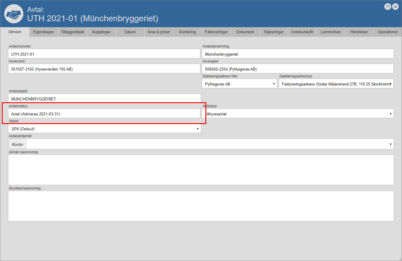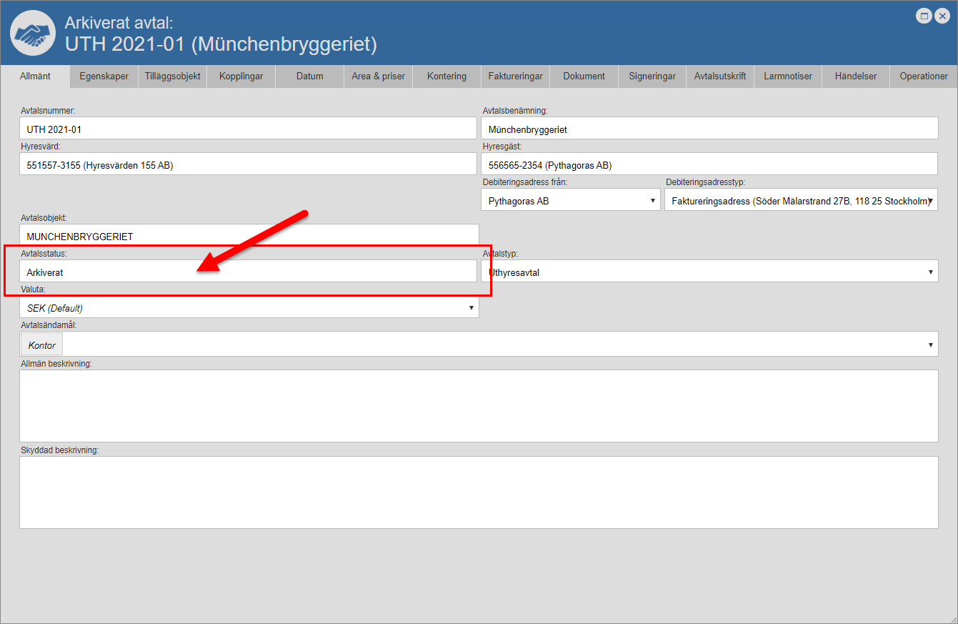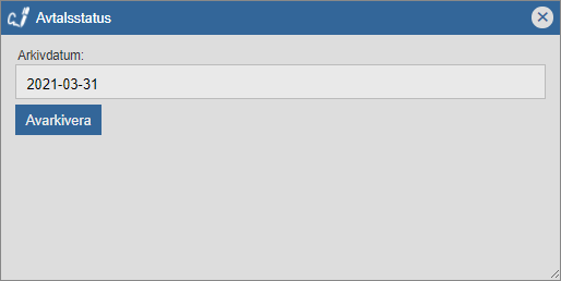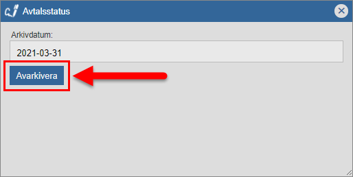 Klicka i fältet med namnet "Avtalsstatus" (se den första bilden nedan). När du klickar i fältet med namnet "Avtalsstatus" får du tillgång till en dialogruta med namnet "Avtalsstatus". I dialogrutan med namnet "Avtalsstatus" hittar du ett fält med namnet "Arkivdatum" och en knapp med namnet "Avarkivera" (se den andra bilden nedan).