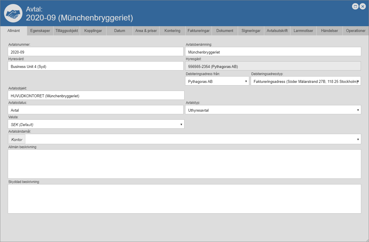 I avtalskortet hittar du fjorton flikar: "Allmänt", "Egenskaper", "Tilläggsobjekt", "Kopplingar", "Datum", "Area & priser", "Kontering", "Betalningar" eller "Faktureringar", "Dokument", "Signeringar", "Avtalsutskrift",