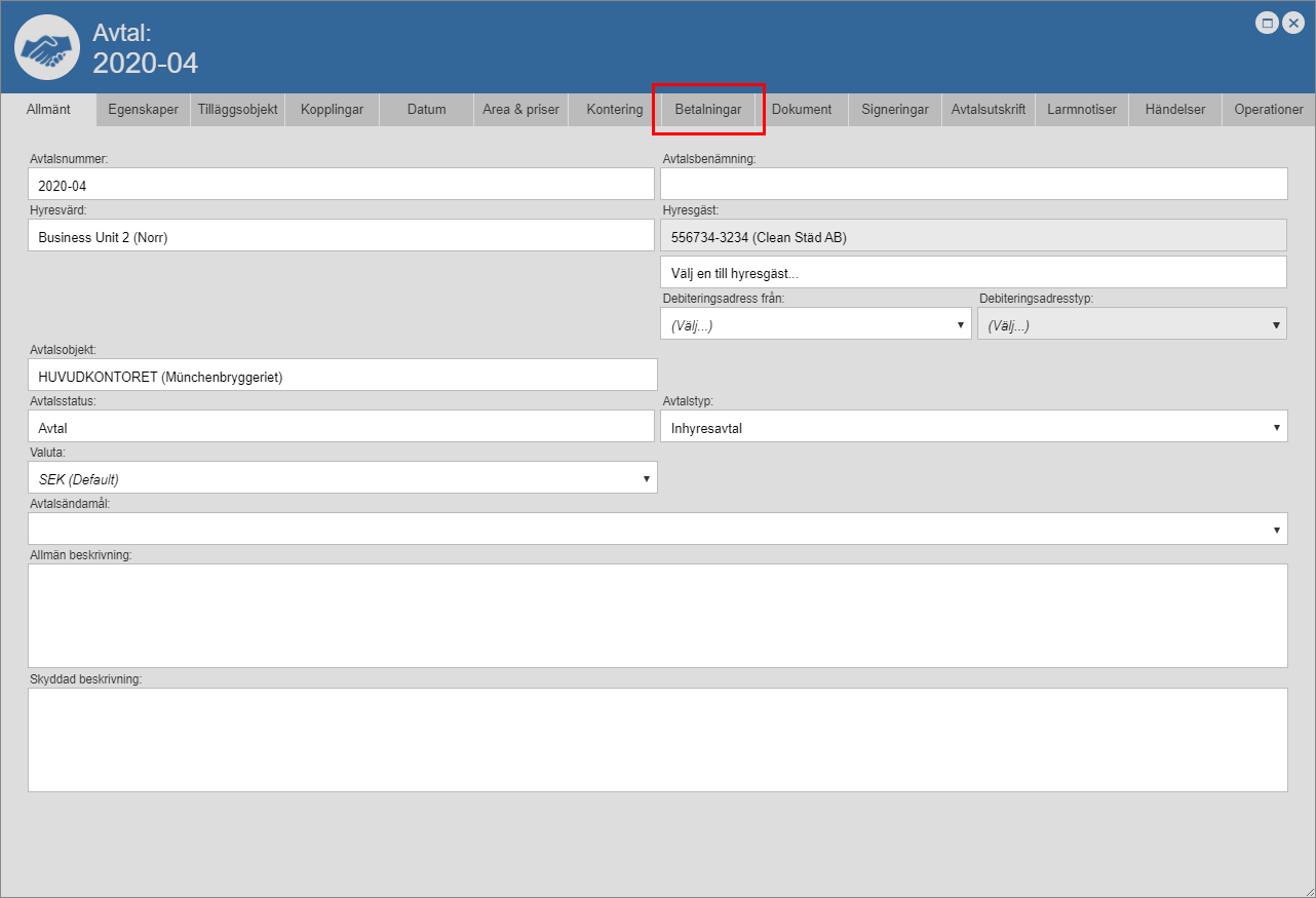 I avtalskortet hittar du en flik med namnet "Betalningar" eller "Faktureringar" (se bilderna nedan). Namnet på fliken styrs av vilken typ av avtal du arbetar med (till exempel ett inhyresavtal, ett uthyresavtal, ett leverantörsavtal eller ett lokalserviceavtal). Under fliken med namnet "Betalningar" eller "Faktureringar" hittar du information om de betalningar eller faktureringar som gjorts på det avtal du arbetar med.