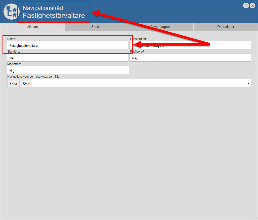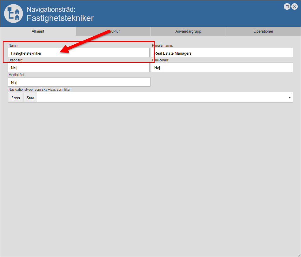 För att du ska kunna byta namn på ett navigationsträd måste du öppna det navigationsträd du vill byta namn på. För mer information om hur du öppnar ett navigationsträd, se avsnitt 5.6.
