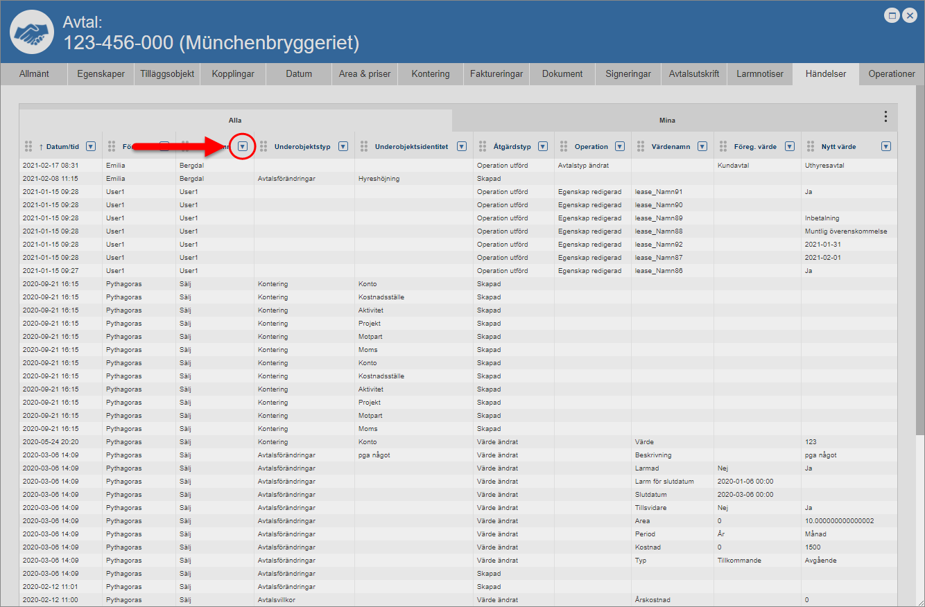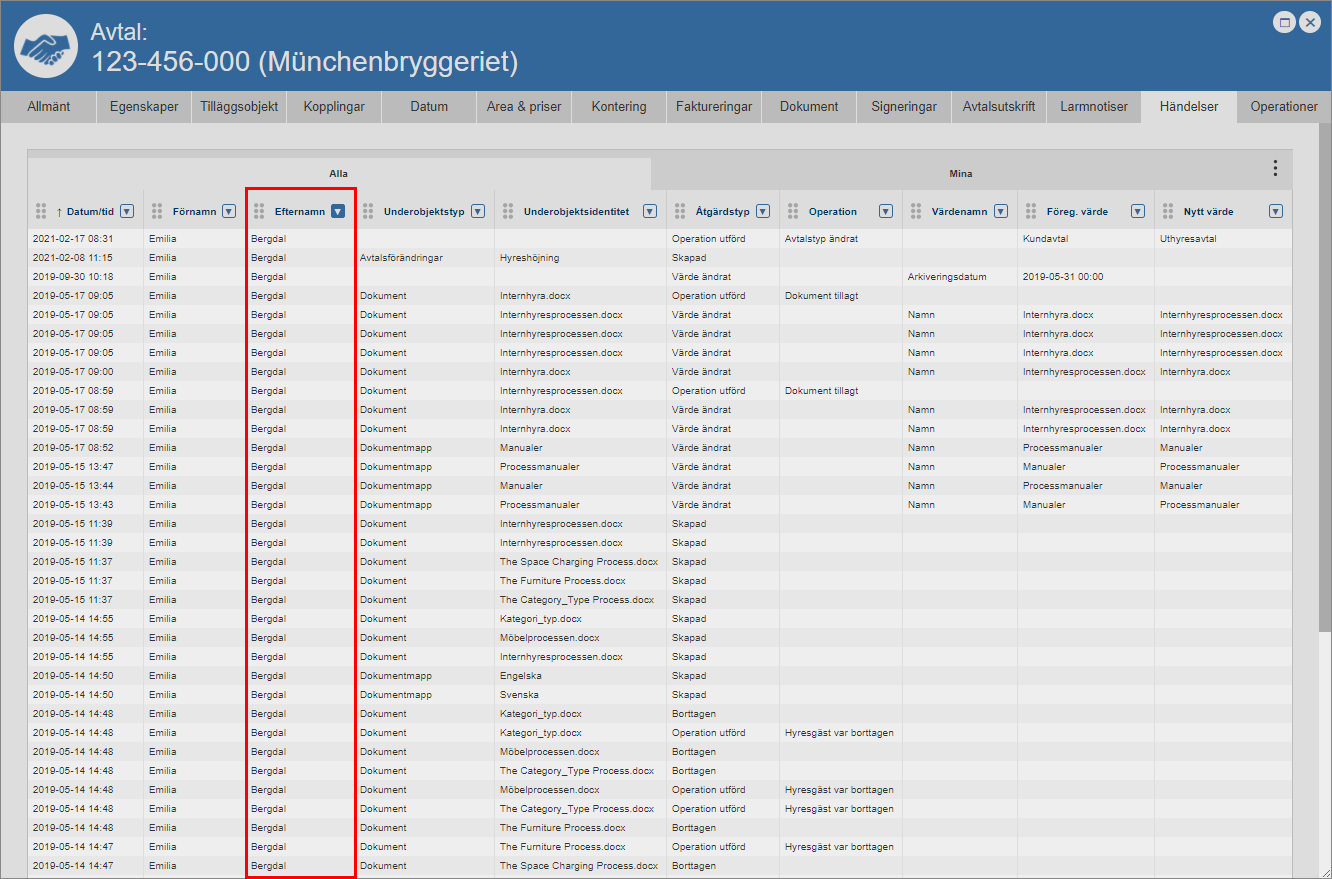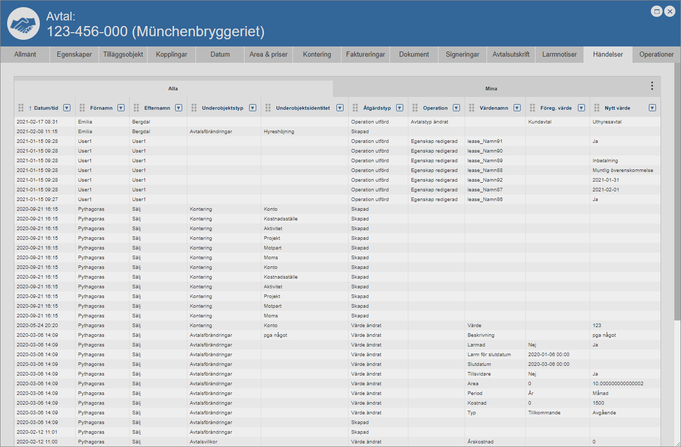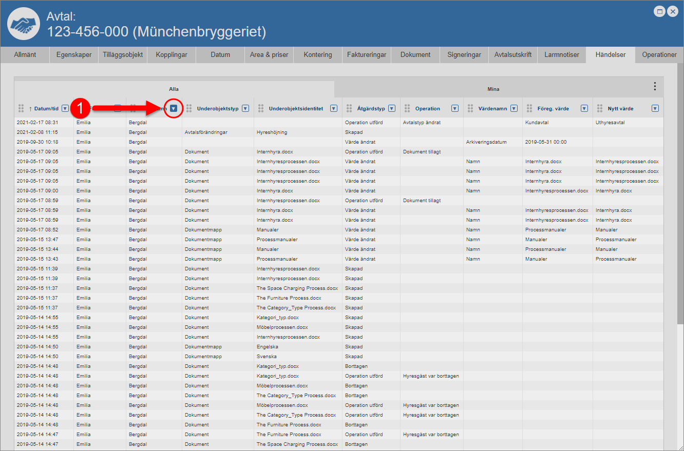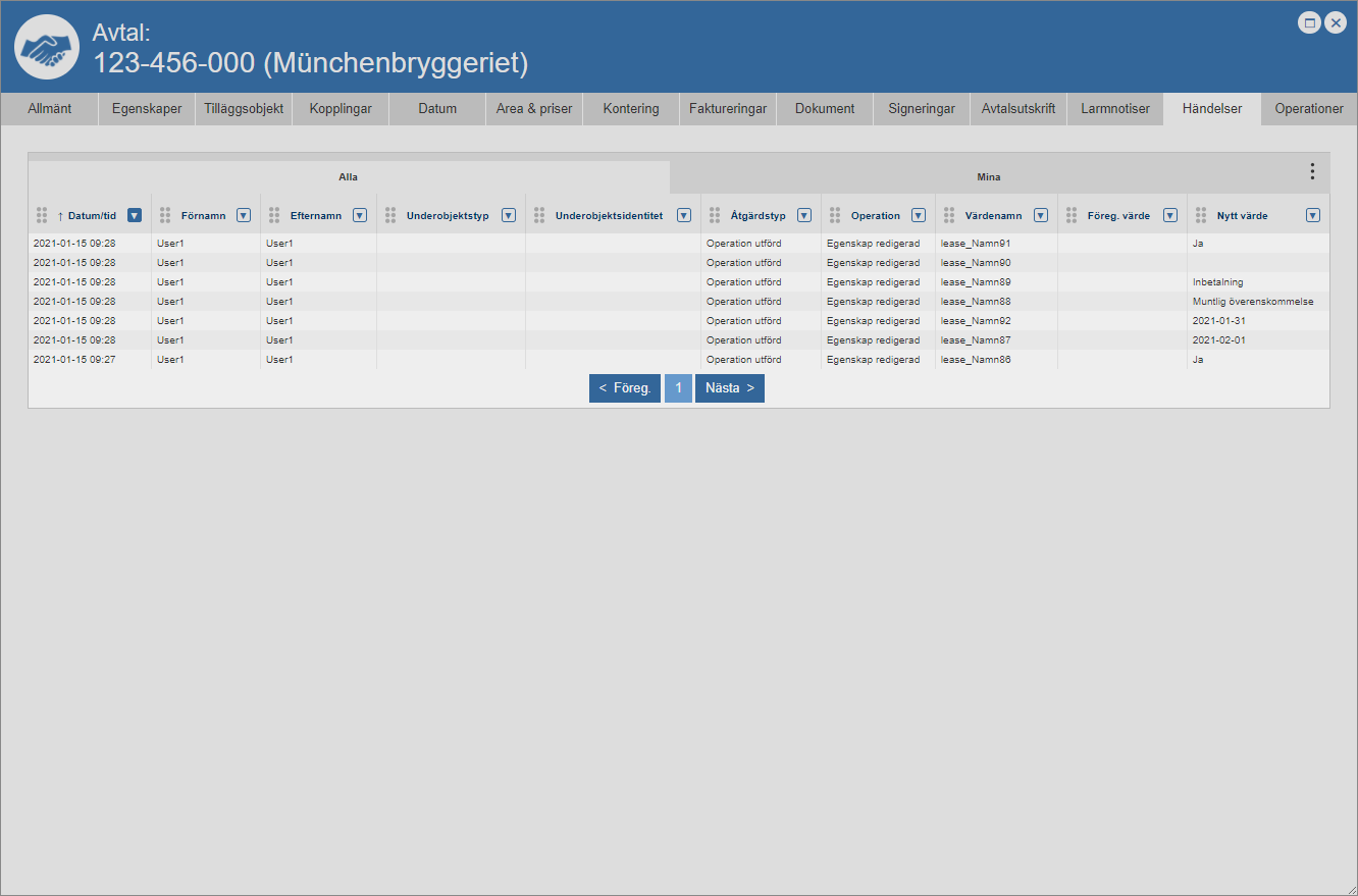 Ställ dig på fliken med namnet "Händelser" (se den första bilden nedan). Detta om du inte redan står på den aktuella fliken. När du ställer dig på fliken med namnet "Händelser" får du tillgång till en händelselogg som är specifik för det avtal du arbetar med (se den andra bilden nedan). Den avtalsspecifika händelseloggen består av en lista med händelser som är kopplade till ett avtal. I händelseloggen hittar du två flikar: "Alla" och "Mina". Men det är inte allt. I händelseloggen hittar du också ett antal kolumner. Vilka kolumner du hittar i händelseloggen beror på vilken vy som visas i denna. Om du har tillgång till mer än en vy kan du själv välja vilken vy som ska visas i händelseloggen. För mer information om hur du väljer vilken vy som ska visas i en lista såsom händelseloggen, se avsnitt 8.15.1.