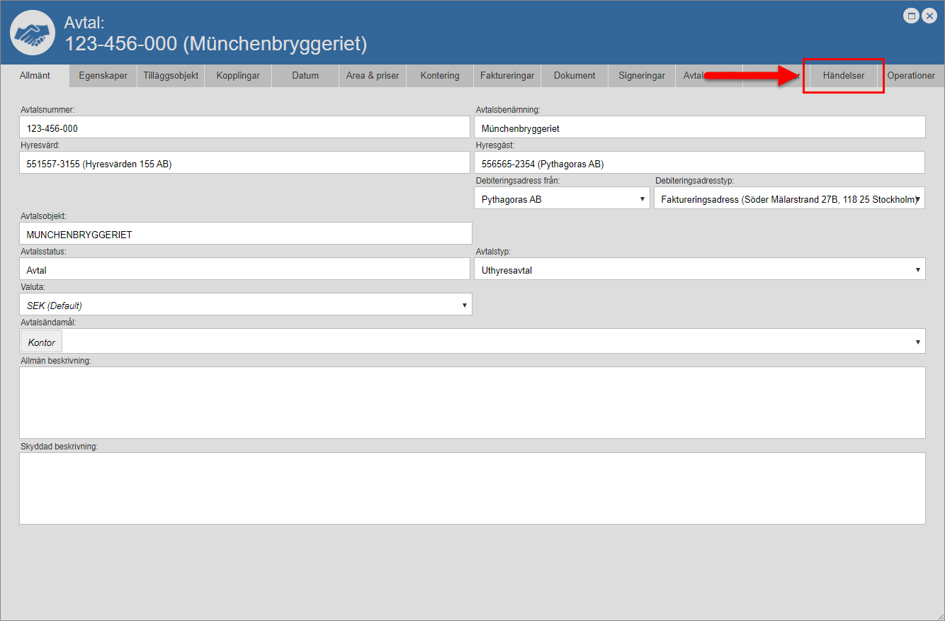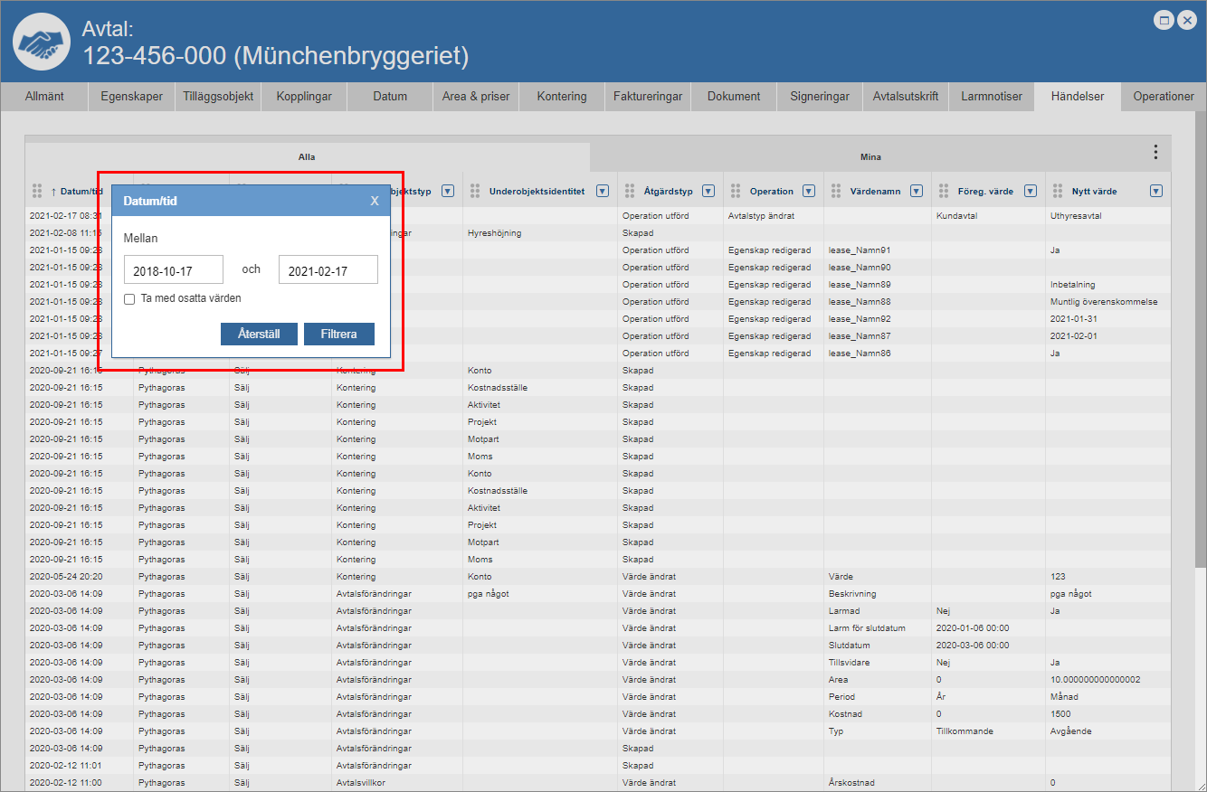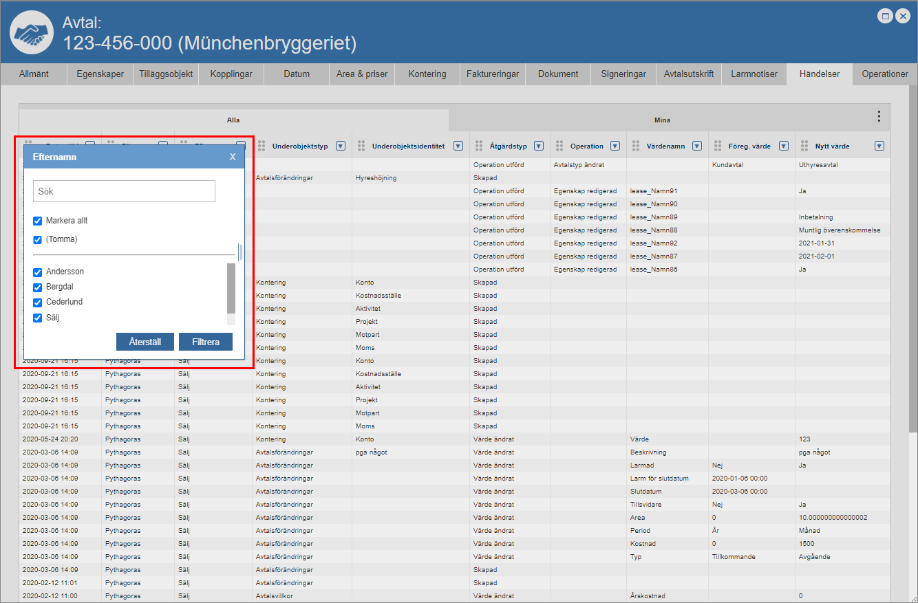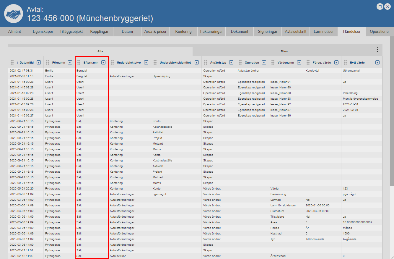 Ställ dig på fliken med namnet "Händelser" (se den första bilden nedan). Detta om du inte redan står på den aktuella fliken. När du ställer dig på fliken med namnet "Händelser" får du tillgång till en händelselogg som är specifik för det avtal du arbetar med (se den andra bilden nedan). Den avtalsspecifika händelseloggen består av en lista med händelser som är kopplade till ett avtal. I händelseloggen hittar du två flikar: "Alla" och "Mina". Men det är inte allt. I händelseloggen hittar du också ett antal kolumner. Vilka kolumner du hittar i händelseloggen beror på vilken vy som visas i denna. Om du har tillgång till mer än en vy kan du själv välja vilken vy som ska visas i händelseloggen. För mer information om hur du väljer vilken vy som ska visas i en lista såsom händelseloggen, se avsnitt 8.15.1.