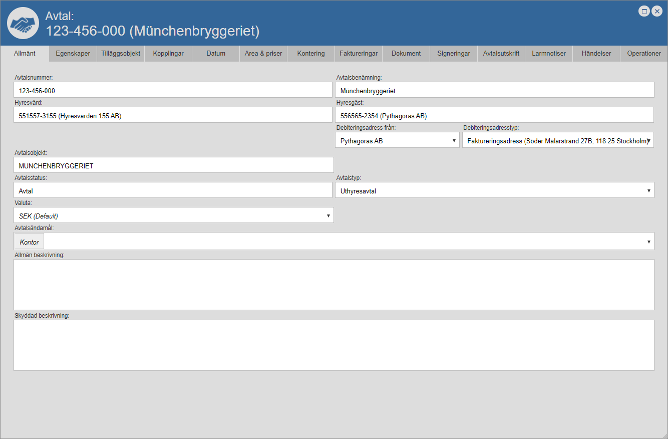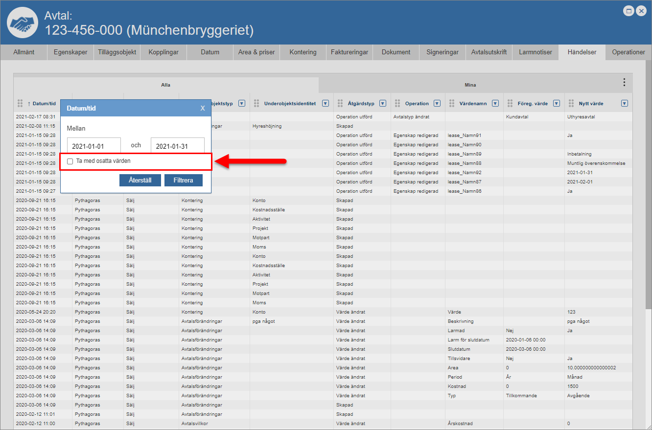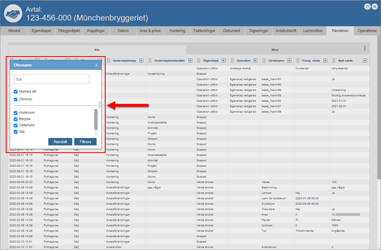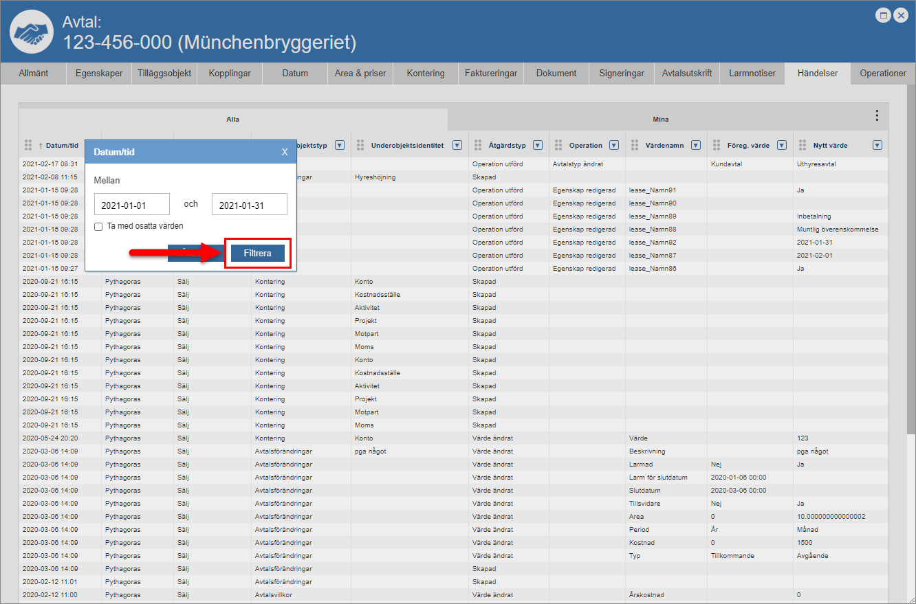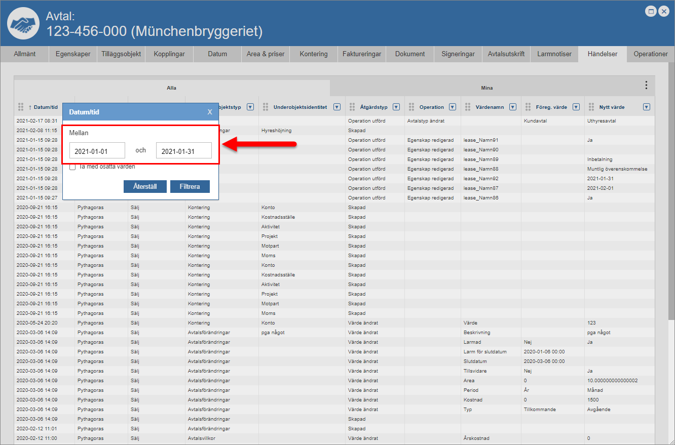 Ställ dig på fliken med namnet "Händelser" (se den första bilden nedan). Detta om du inte redan står på den aktuella fliken. När du ställer dig på fliken med namnet "Händelser" får du tillgång till en händelselogg som är specifik för det avtal du arbetar med (se den andra bilden nedan). Den avtalsspecifika händelseloggen består av en lista med händelser som är kopplade till ett avtal. I händelseloggen hittar du två flikar: "Alla" och "Mina". Men det är inte allt. I händelseloggen hittar du också ett antal kolumner. Vilka kolumner du hittar i händelseloggen beror på vilken vy som visas i denna. Om du har tillgång till mer än en vy kan du själv välja vilken vy som ska visas i händelseloggen. För mer information om hur du väljer vilken vy som ska visas i en lista såsom händelseloggen, se avsnitt 8.15.1.