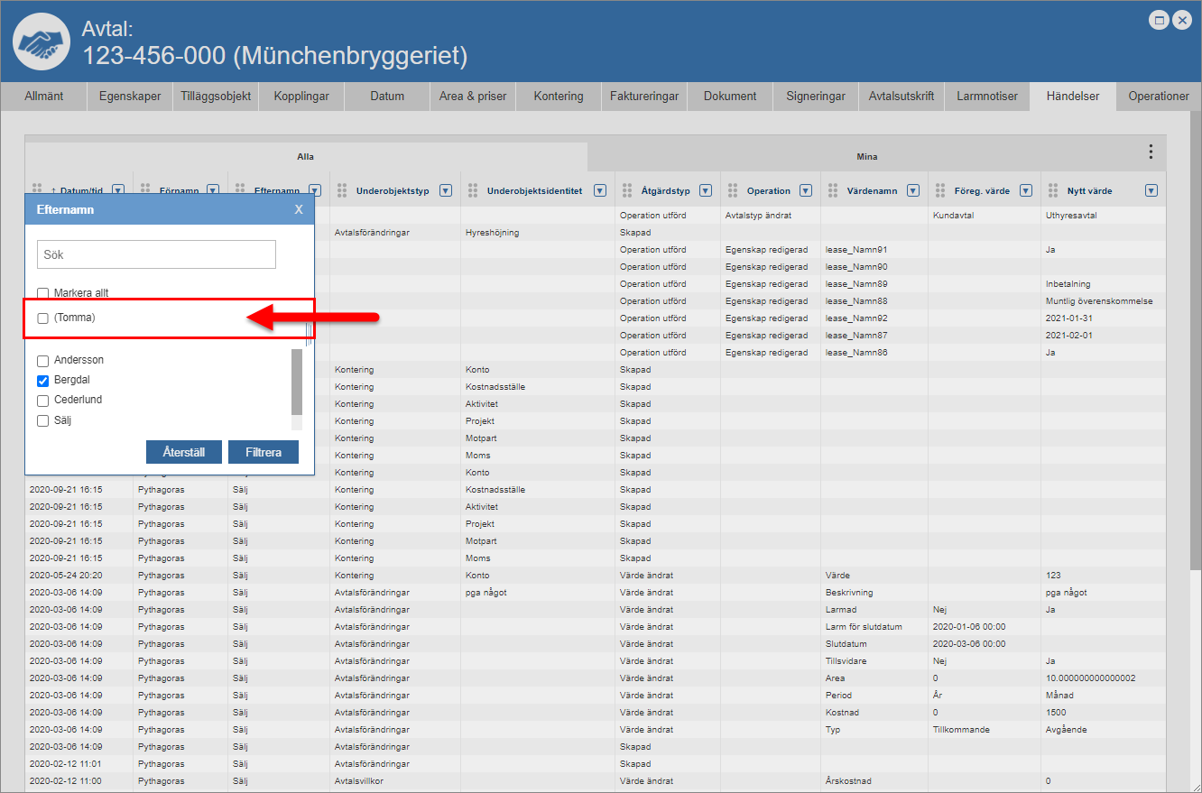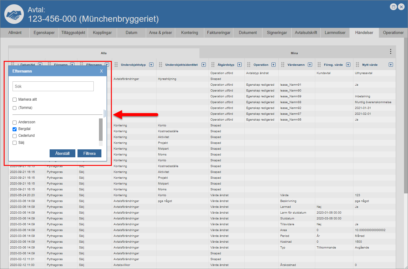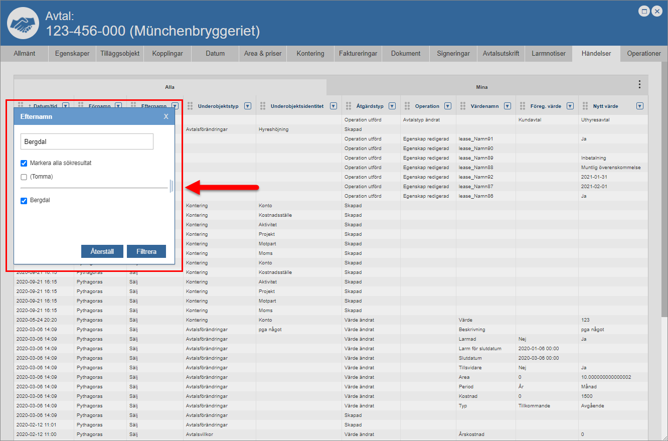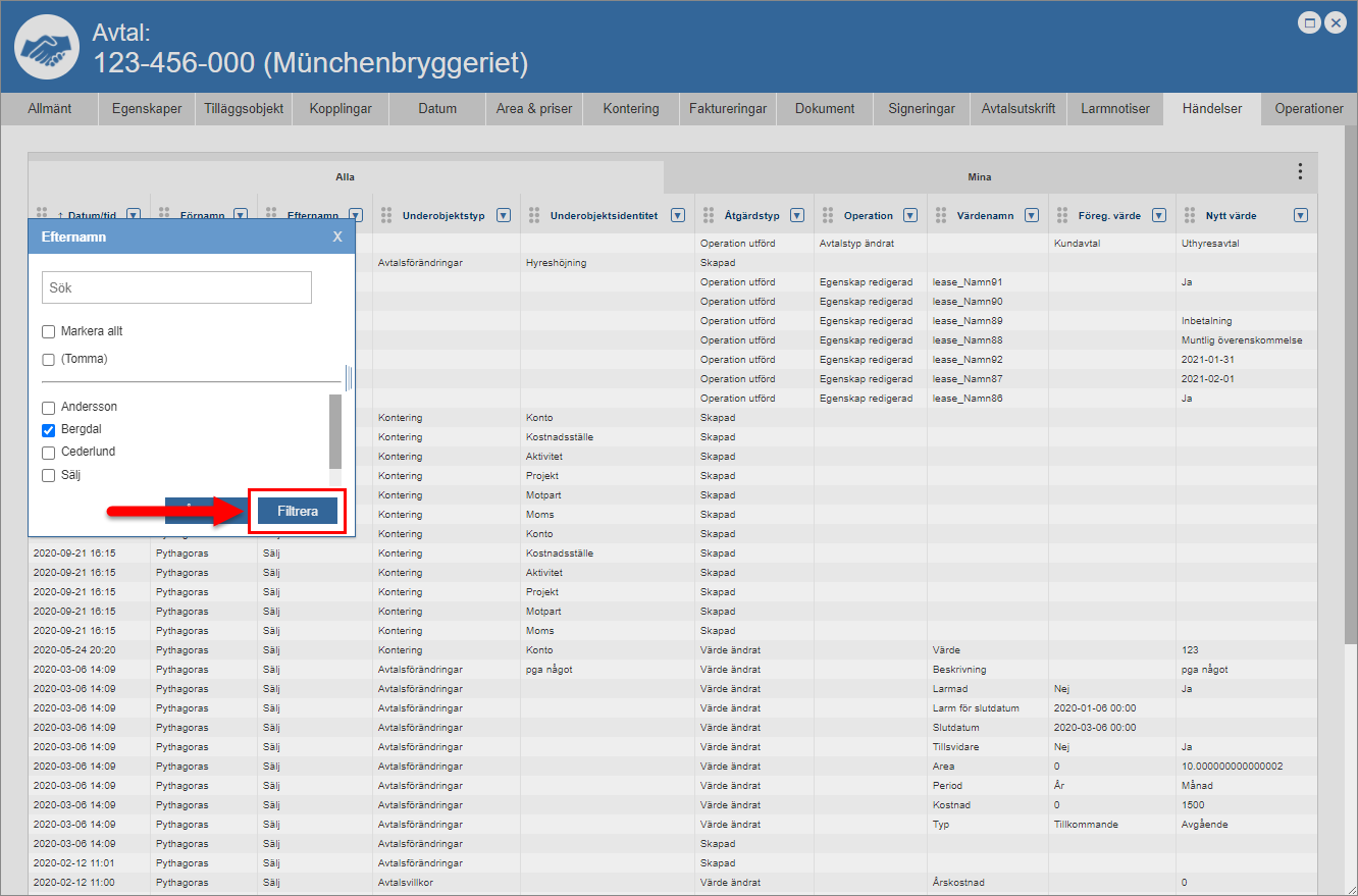 Klicka på knappen med namnet "Filtrera" eller Enter-tangenten på ditt tangentbord (se den första bilden nedan). När du klickar på knappen med namnet "Filtrera" eller Enter-tangenten på ditt tangentbord kommer en filtrering att genomföras. När en filtrering har genomförts skickas du tillbaka till händelseloggen. I händelseloggen hittar du den eller de händelser som kunnat matchas mot din filtrering. I den andra bilden nedan ser du att vi valde att filtrera fram alla händelser som kunde kopplas till en användare med efternamnet "Bergdal" i händelseloggen. Notera att du kan filtrera i flera kolumner samtidigt. Om du vill göra din filtrering mer specifik kan du filtrera i någon eller några av de kolumner du inte redan filtrerat i. För mer information om hur du återställer en kolumn efter att du filtrerat i den, gå till slutet av detta avsnitt.