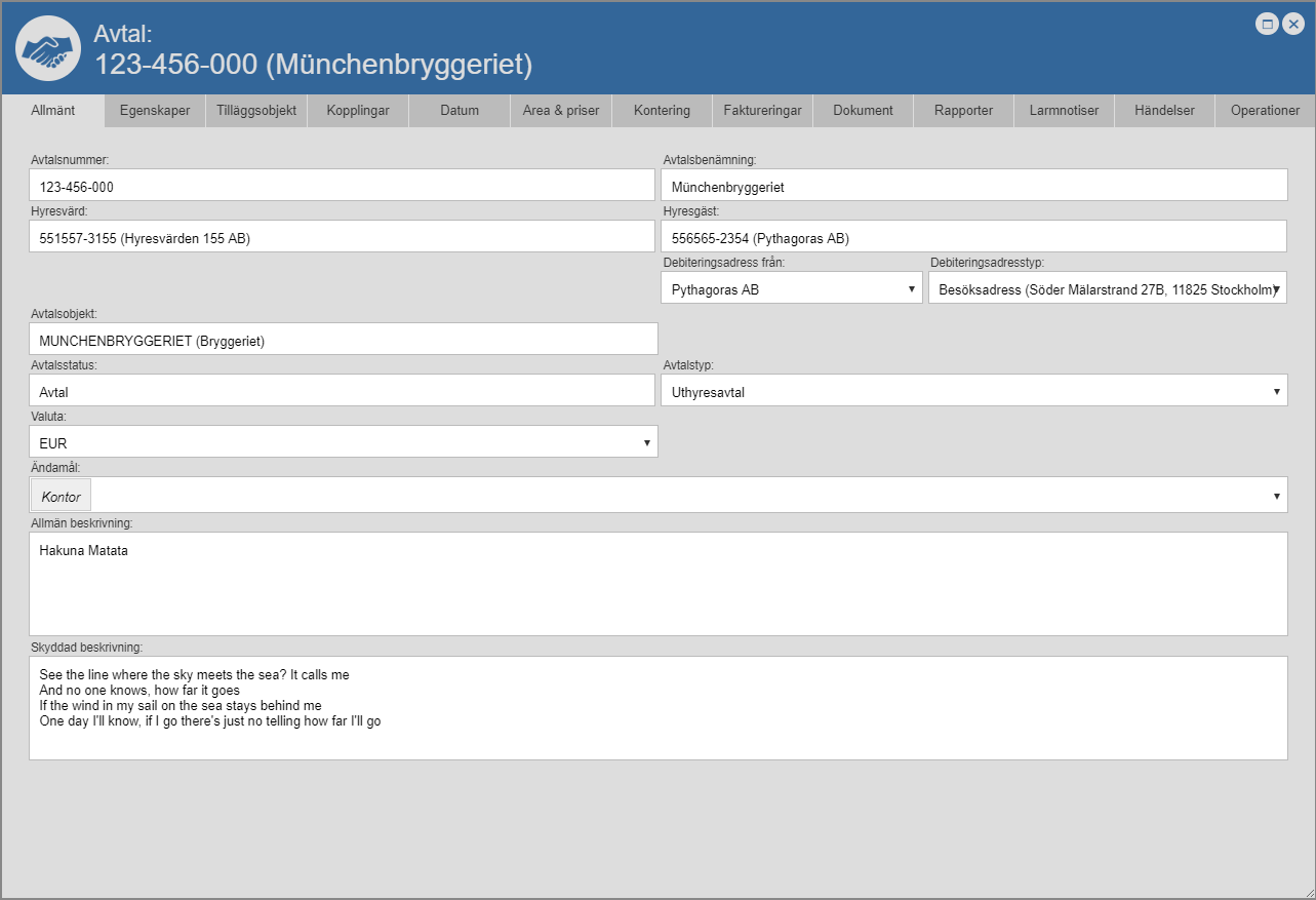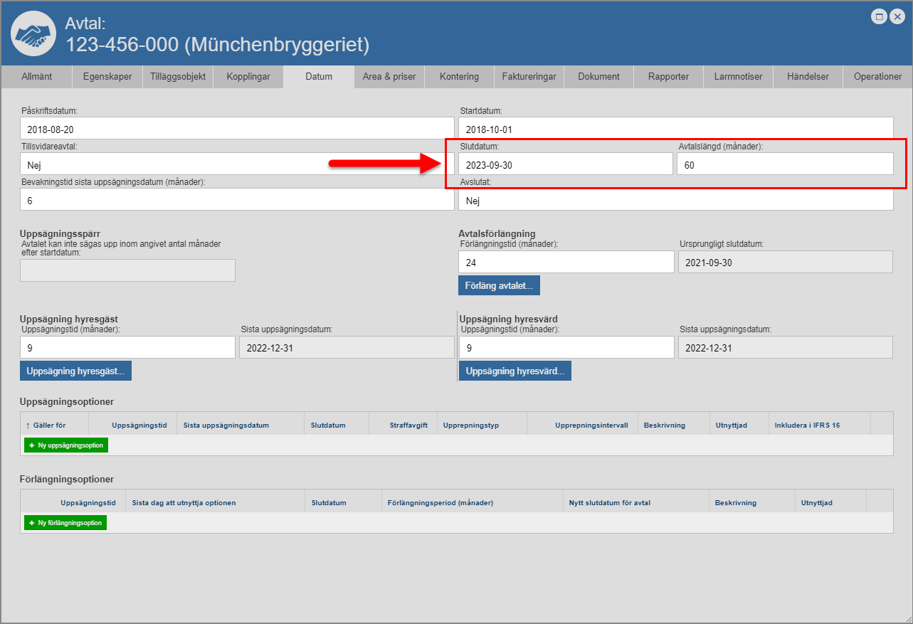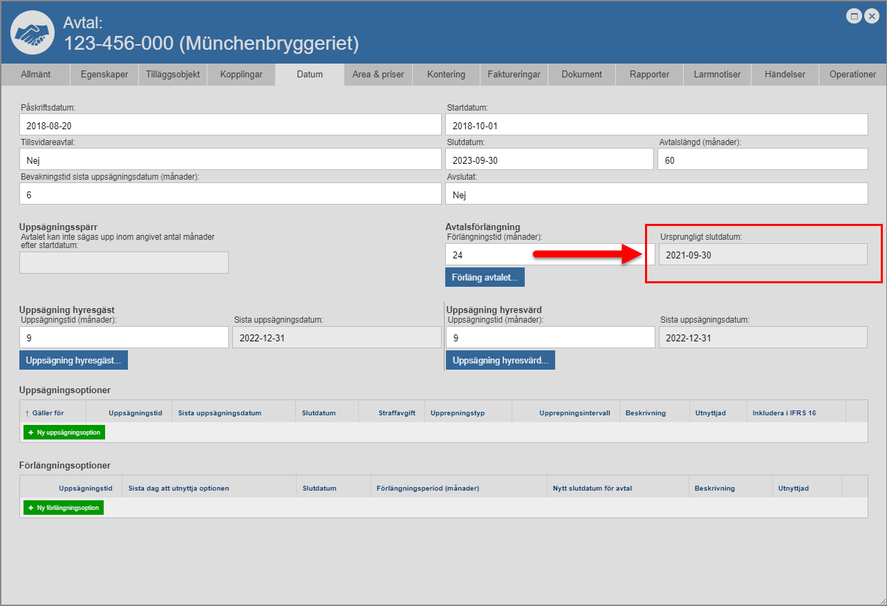 Klicka i "OK" i den dialogruta du fått tillång till (se den första bilden nedan). När du klickar "OK" i den dialogruta du fått tillgång till kommer det avtal du arbetar med förlängas med den förlängningstid som finns specificerad i fältet med namnet "Förlängningstid". När ett avtal förlängs ändras avtalets slutdatum och avtalslängd (se den andra bilden nedan). När ett avtal förlängs kan du se avtalets ursprungliga slutdatum i avtalskortet (se den tredje bilden nedan).