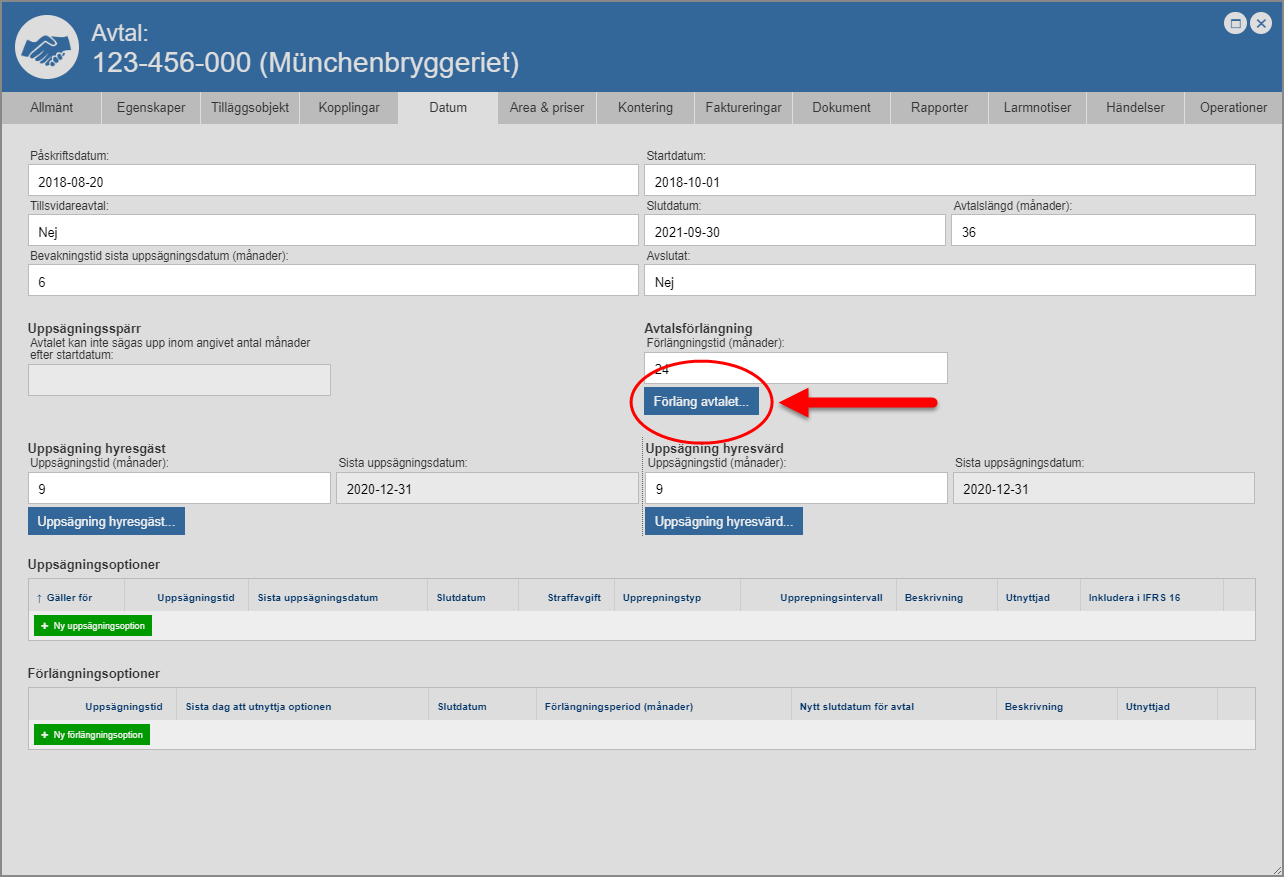 Ställ dig på fliken med namnet "Datum" (se den första bilden nedan). Detta om du inte redan står på den aktuella fliken. När du ställer dig på fliken med namnet "Datum" får du tillgång till ett antal fält och ett antal knappar (se den andra bilden nedan). Notera att en av de knappar du får tillgång till har namnet "Förläng avtalet".