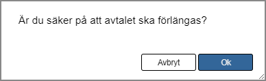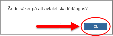 Klicka på knappen med namnet "Förläng avtalet" (se den första bilden nedan). När du klickar på knappen med namnet "Förläng avtalet" får du tillgång till en dialogruta. Via den dialogruta du får tillgång till får du följande fråga: "Är du säker på att avtalets ska förlängas?" (se den andra bilden nedan).