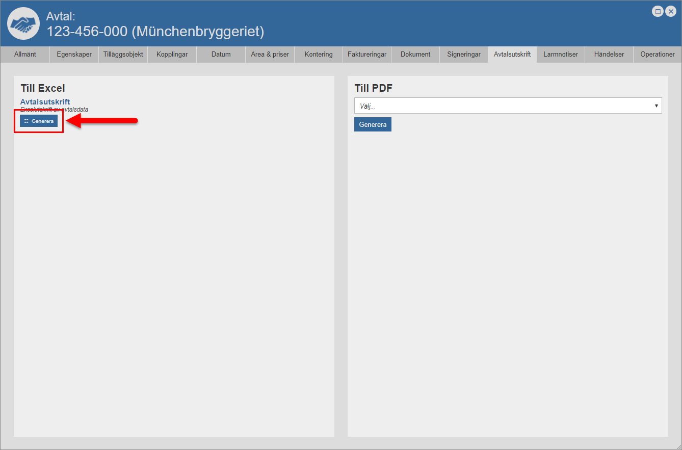 Klicka på knappen med namnet "Generera" (se den första bilden nedan). När du klickar på knappen med namnet "Generera" kommer det data som är satt på det avtal du arbetar med att sammanställas i ett Excel-dokument som du kan spara och/eller skriva ut (se den andra bilden nedan).