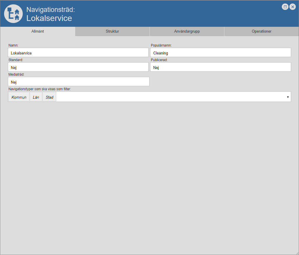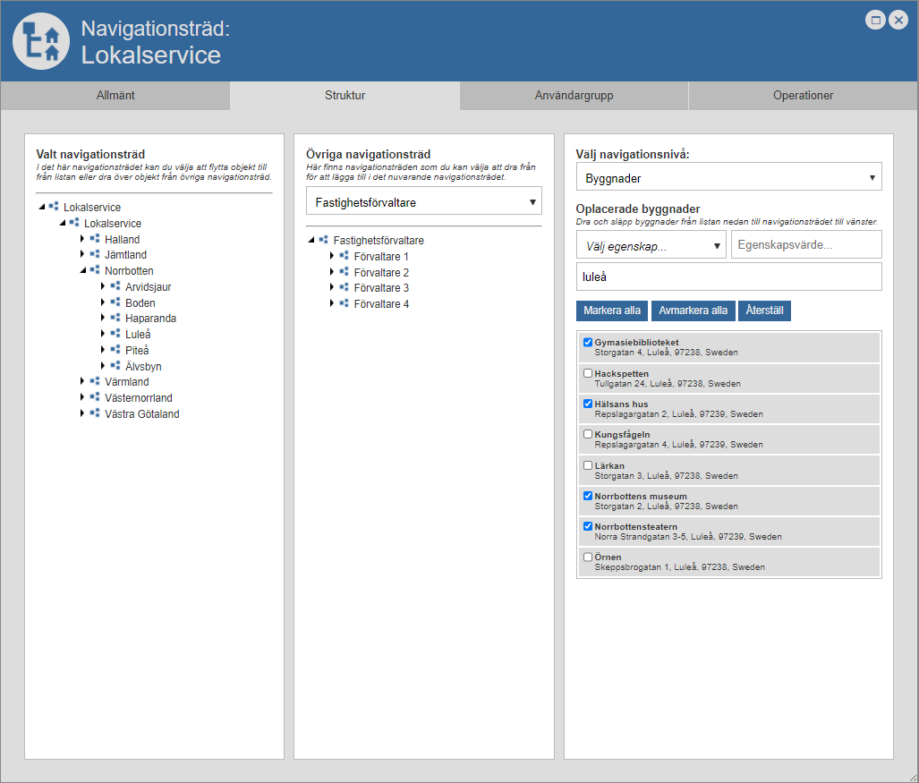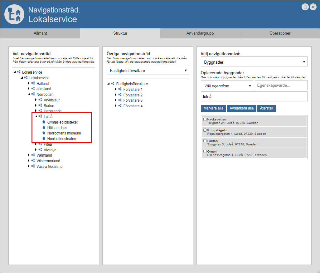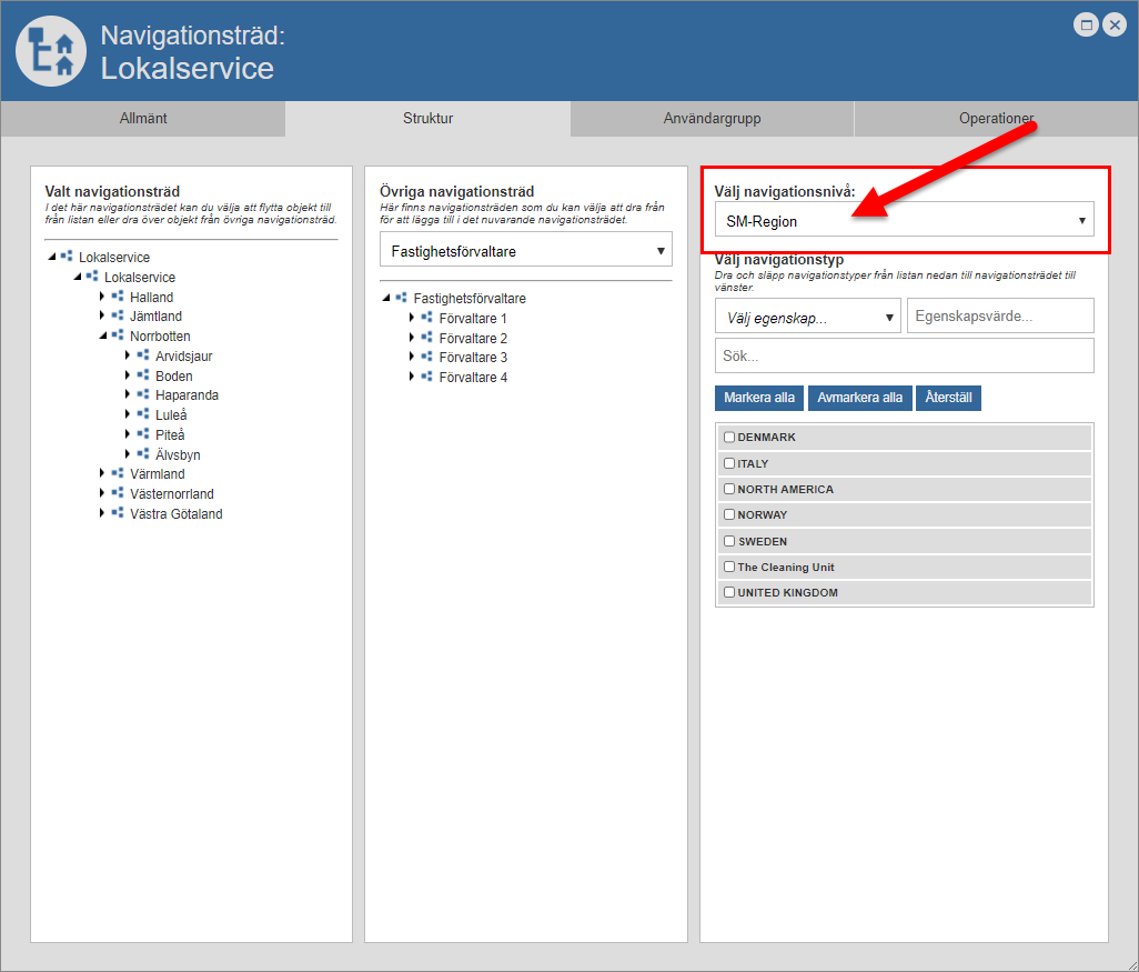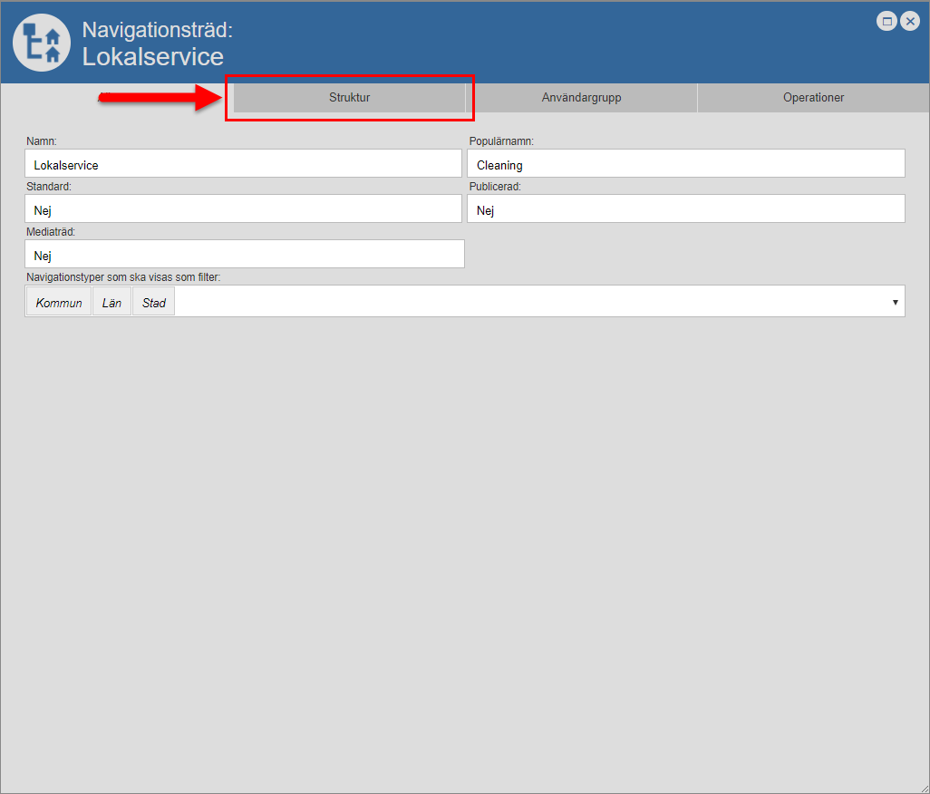 Ställ dig på fliken med namnet "Struktur" (se den första bilden nedan). Detta om du inte redan står på den aktuella fliken. När du ställer dig på fliken med namnet "Struktur" får du tillgång till tre kolumner: "Valt navigationsträd", "Övriga navigationsträd" och "Välj navigationsnivå" (se den andra bilden nedan).