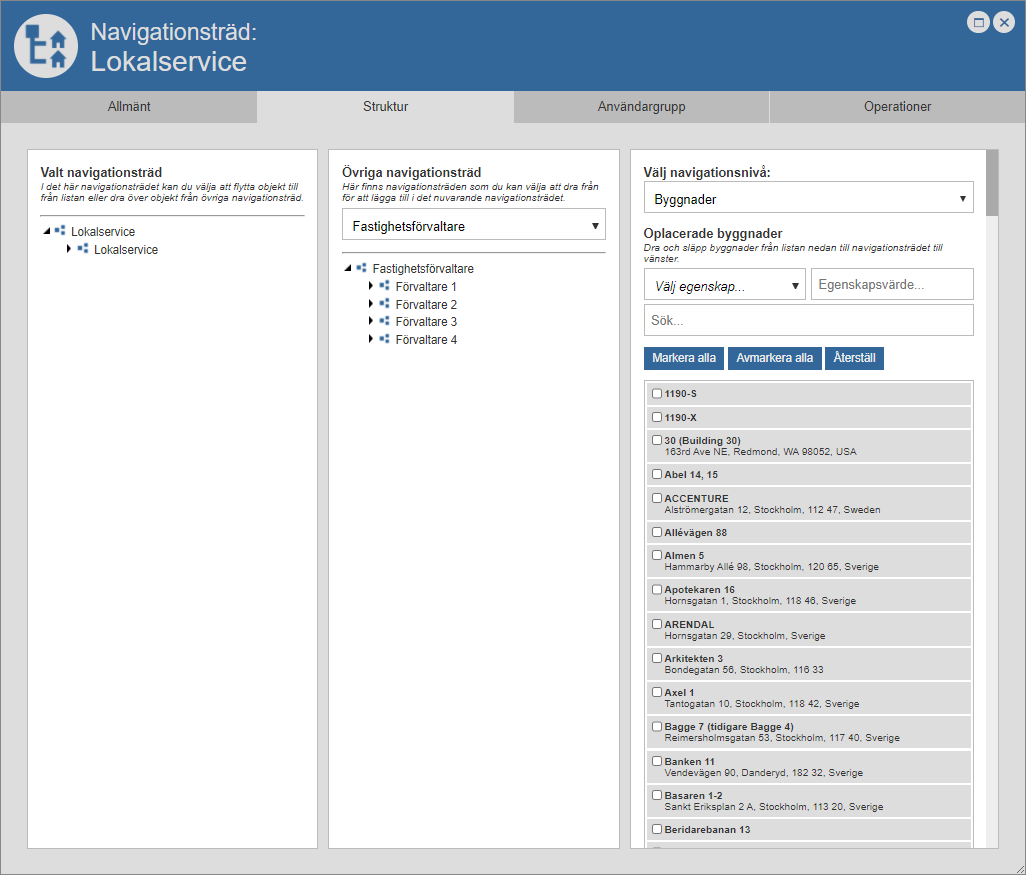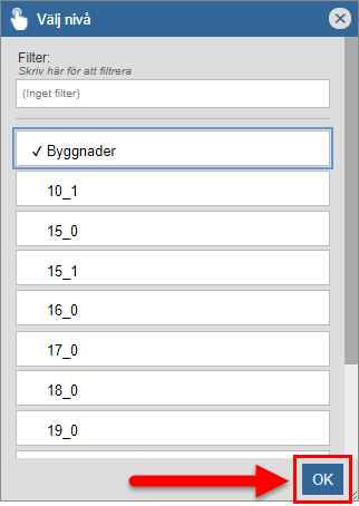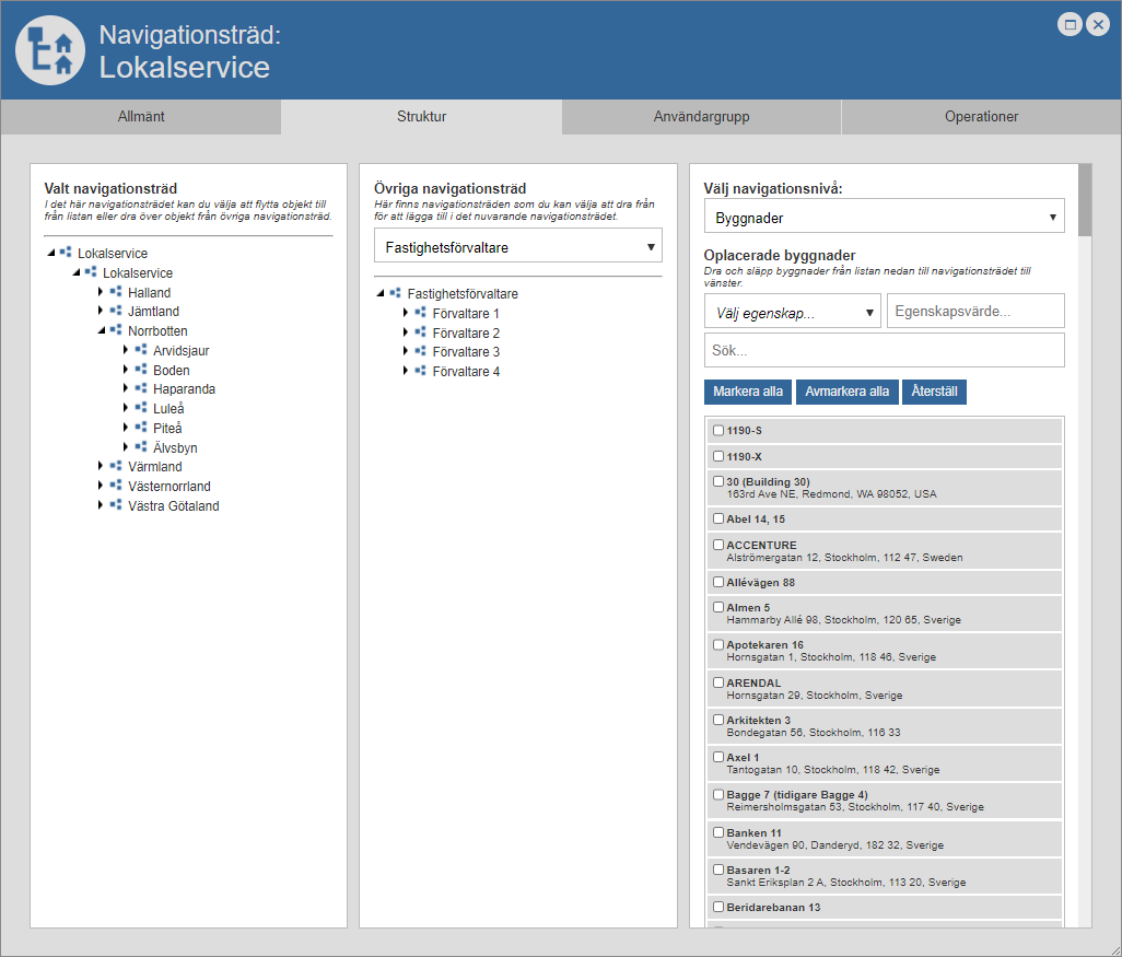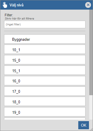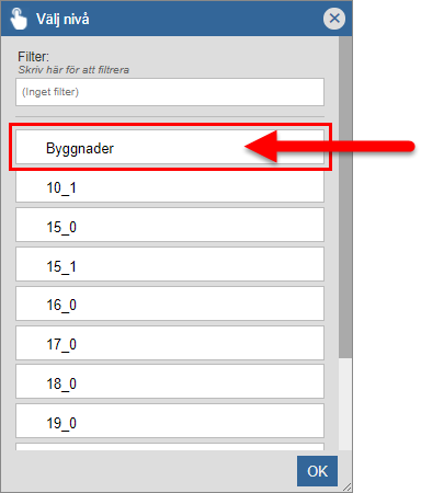 Klicka på navigationsnivån med namnet "Byggnader" (se den första bilden nedan). Avsluta sedan med att klicka "OK" (se den andra bilden nedan). När du klickar "OK" i listan med navigationsnivåer skickas du tillbaka till navigationsträdskortet. I navigationsträdskortet hittar du en lista med oplacerade byggnader. I listan med oplacerade byggnader hittar du alla byggnader du kan lägga till i det navigationsträd du skapat (se den tredje bilden nedan).