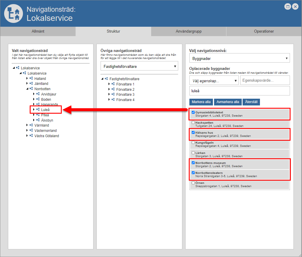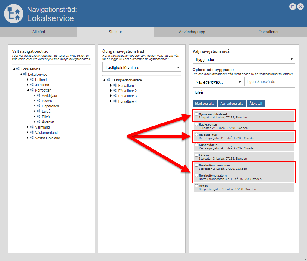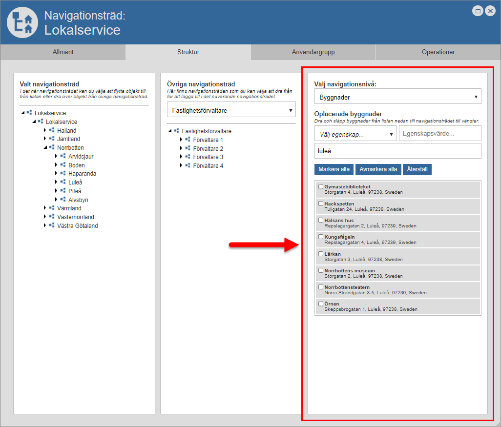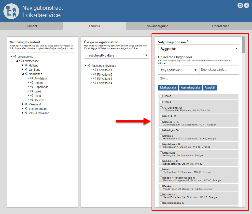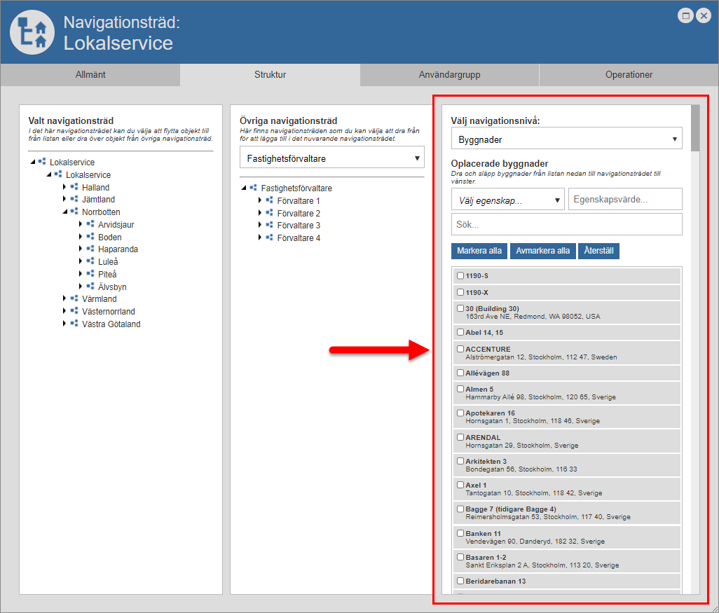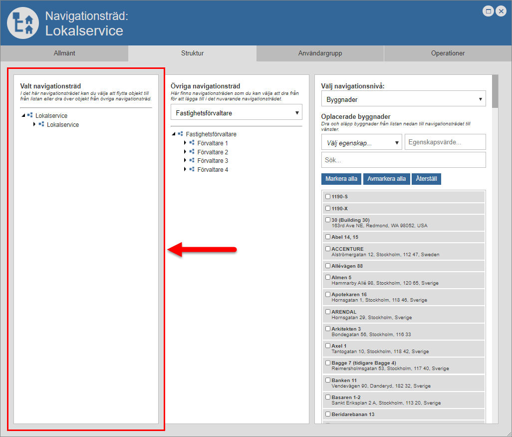Välj den eller de byggnader du vill lägga till i det navigationsträd du skapat. Detta genom att klicka på en eller fler byggnader i listan med oplacerade byggnader (se den första bilden nedan). Notera att den eller de byggnader du klickar på kommer att väljas (se den andra bilden nedan).
