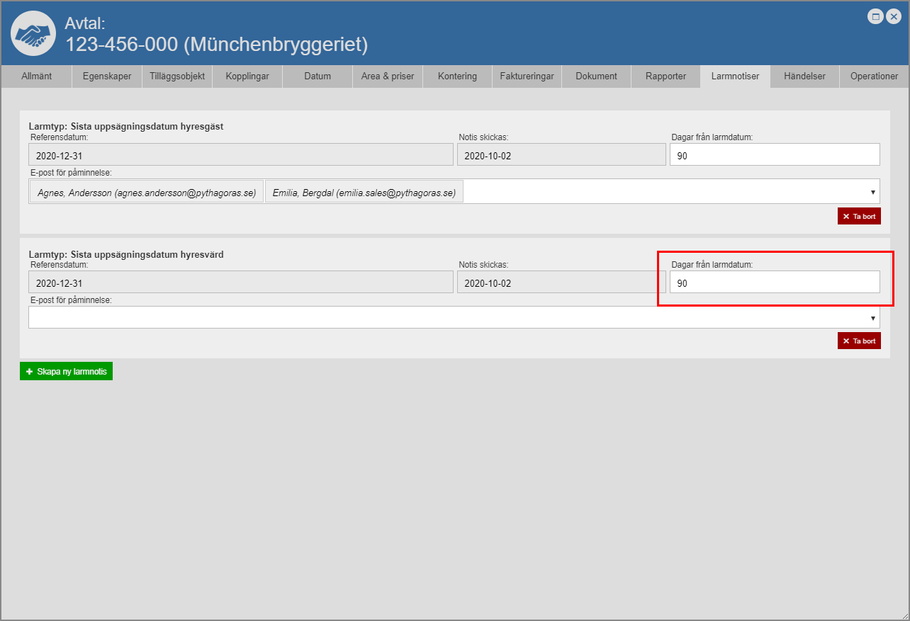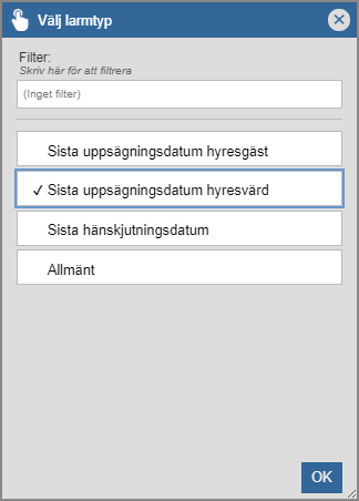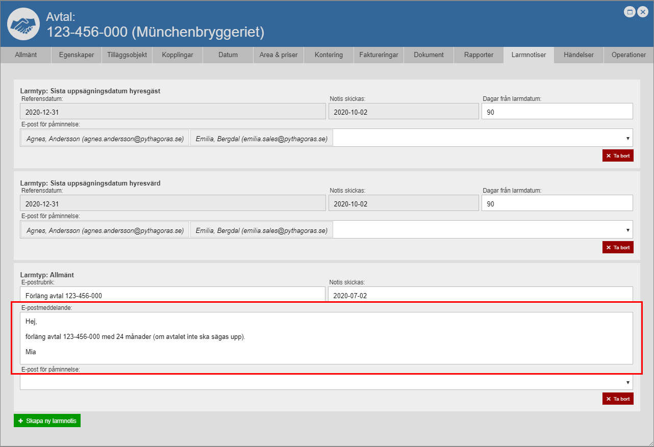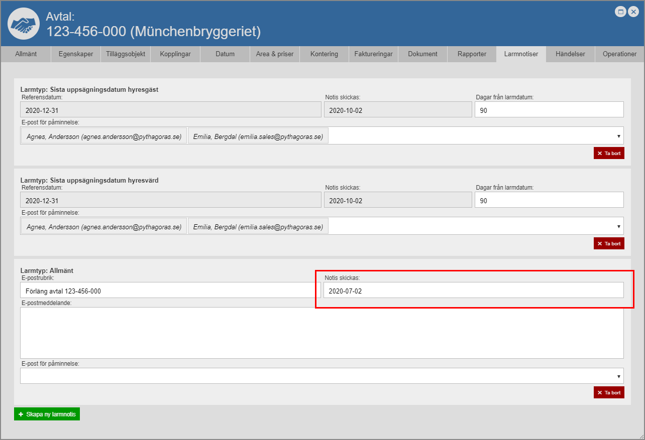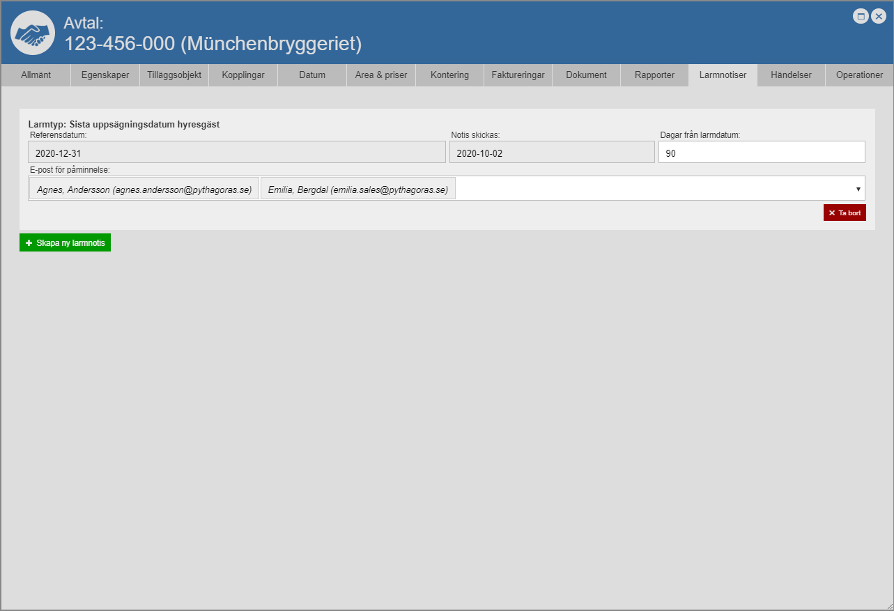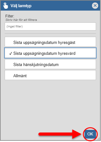 Om du hart skapat en larmnotis av typen "Sista uppsägningsdatum hyresgäst", "Sista uppsägningsdatum hyresvärd" eller "Sista hänskjutningsdatum" ska du