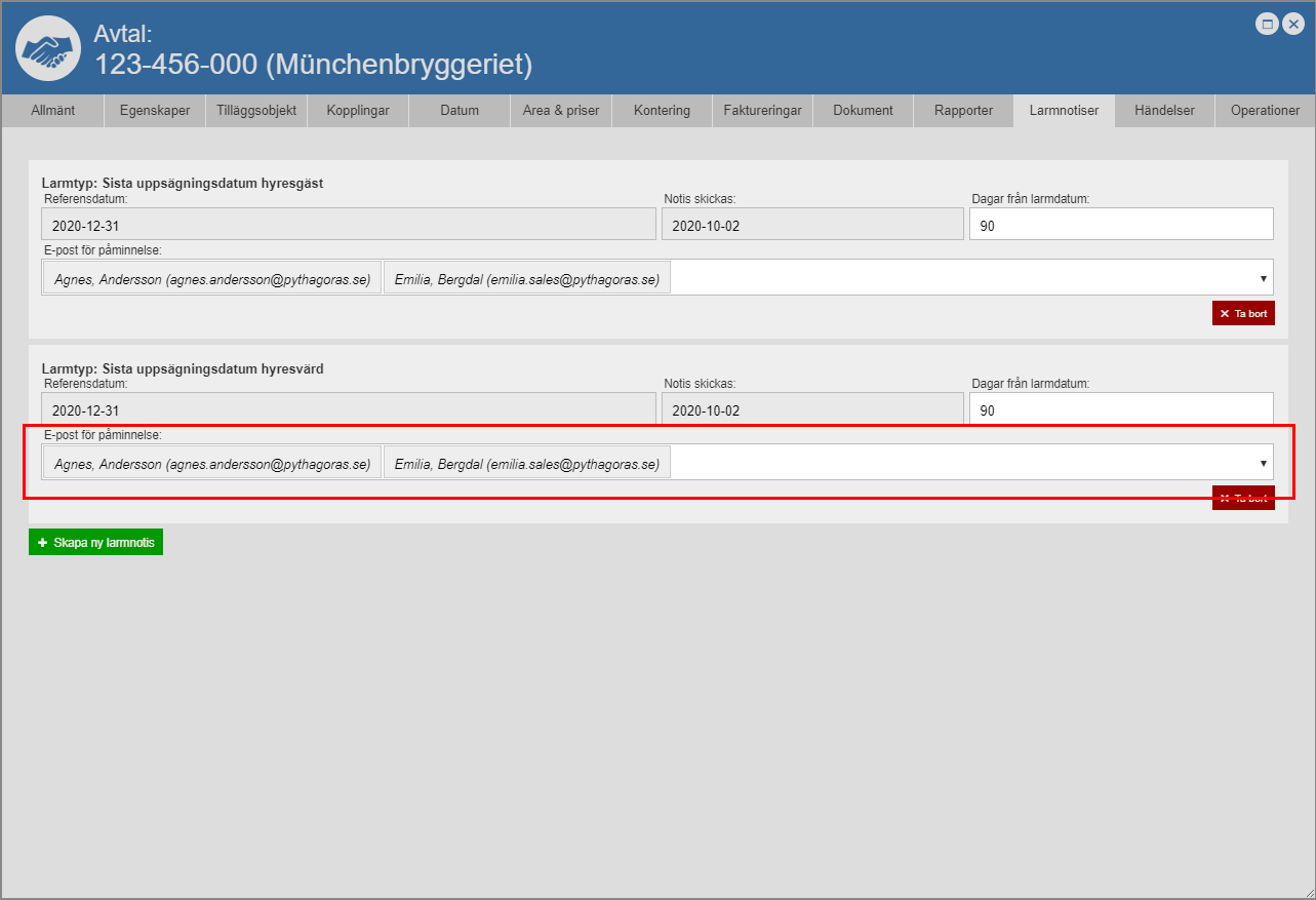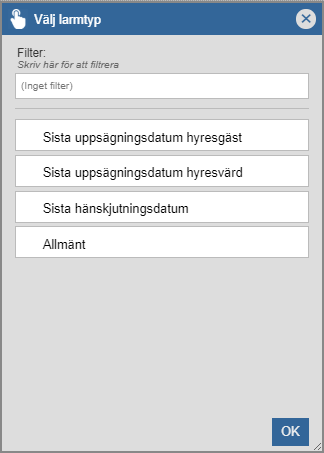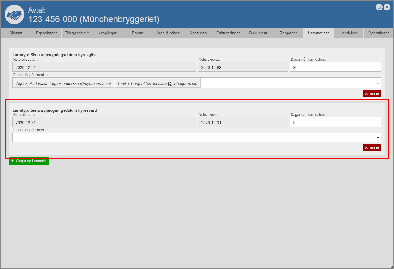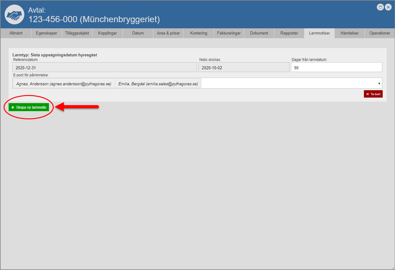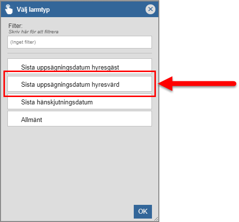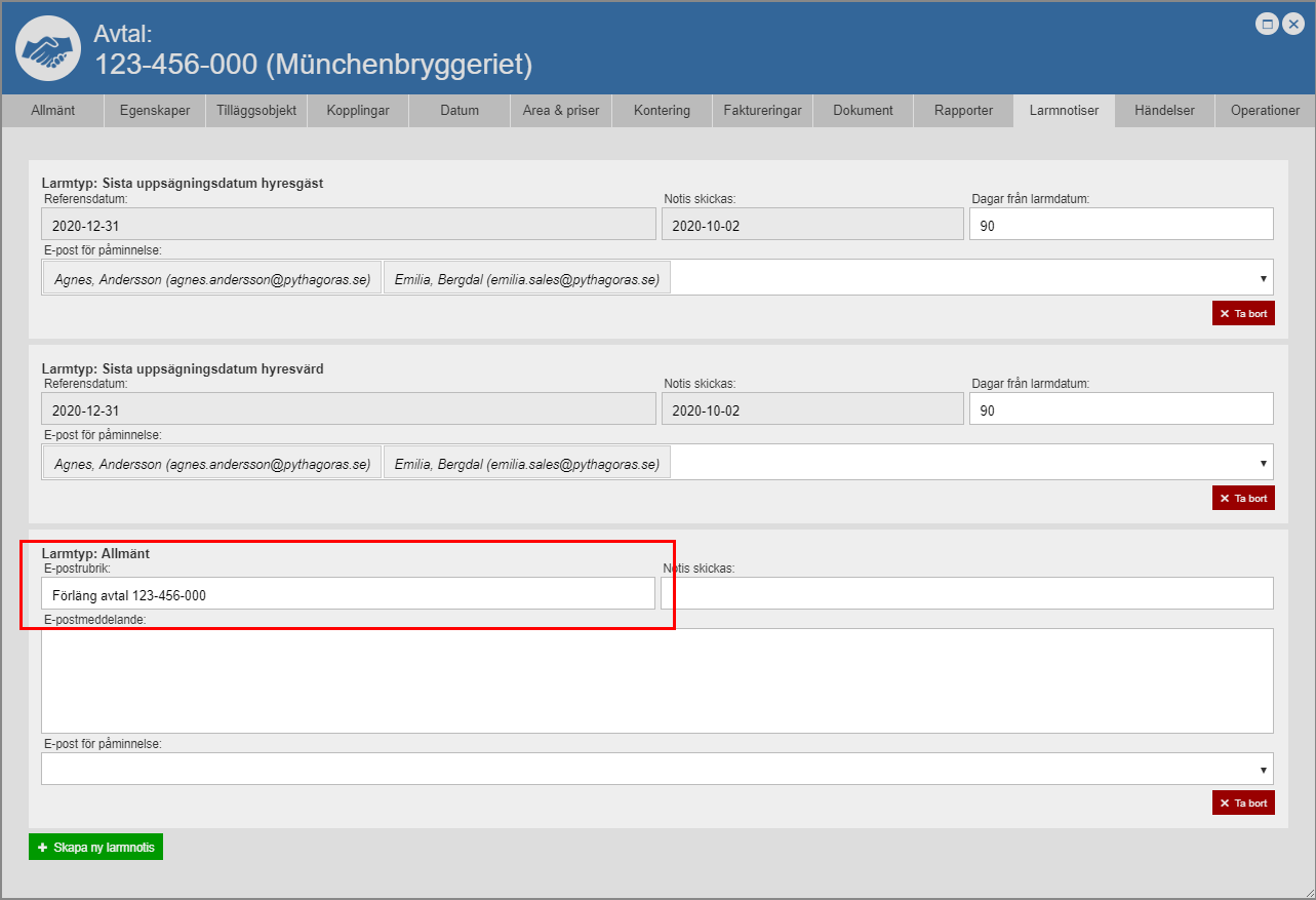 Om du hart skapat en larmnotis av typen "Sista uppsägningsdatum hyresgäst", "Sista uppsägningsdatum hyresvärd" eller "Sista hänskjutningsdatum" ska du