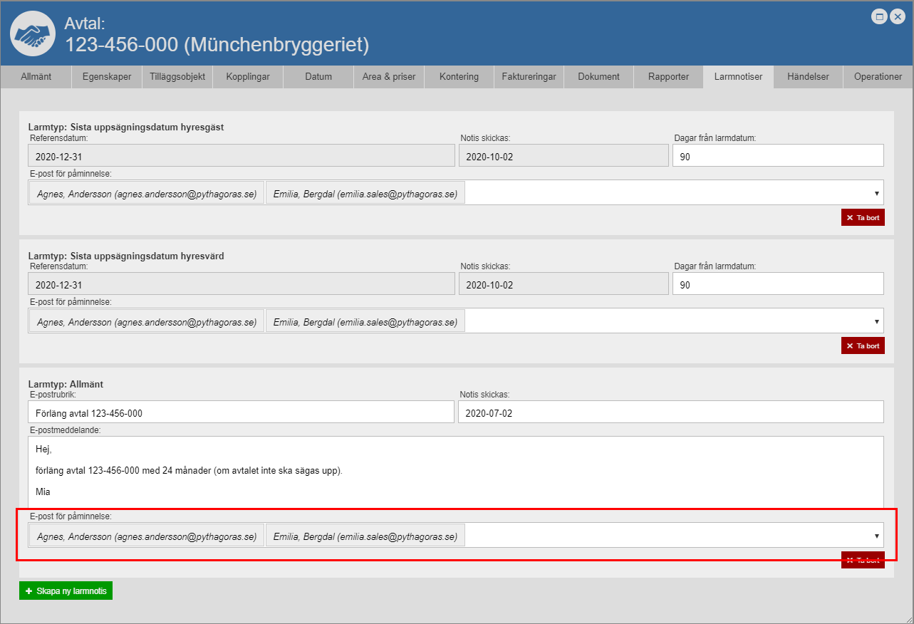 använda fältet med namnet "Epost för påminnelse" till att ange vilken eller vilka personer den larmnotis du skapat ska skickas till (se bilden nedan).