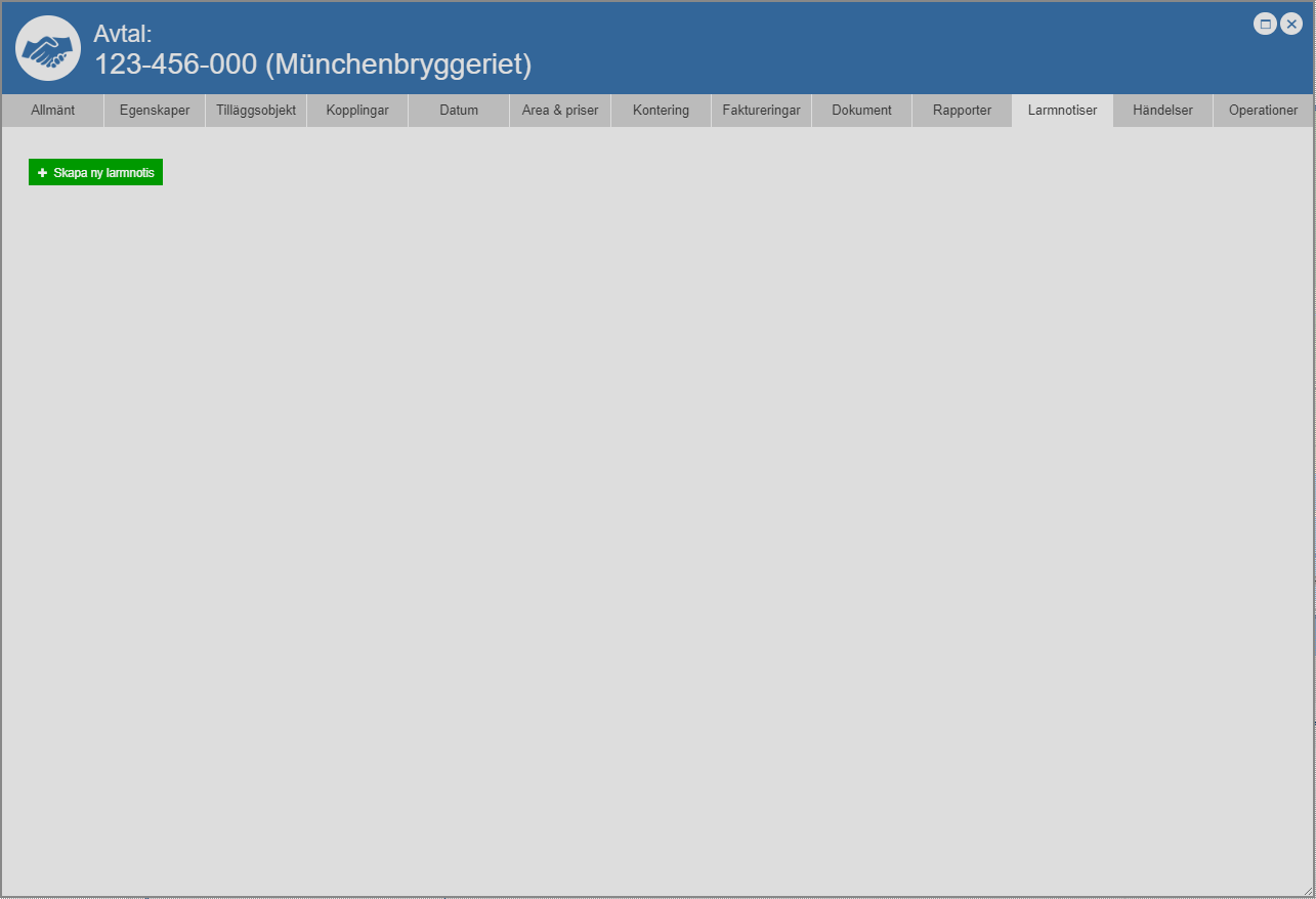 Ställ dig på fliken med namnet "Larmnotiser" (se den första bilden nedan). Detta om du inte redan står på den aktuella fliken. När du ställer dig på fliken med namnet "Larmnotiser" får du tillgång till en lista med larmnotiser och en knapp med namnet "Skapa ny larmnotis" (se den andra bilden nedan). Obs! Om det inte finns några larmnotiser i det avtal du arbetar med får du inte tillgång till någon lista med larmnotiser; då får du bara tillgång knappen med namnet "Skapa ny larmnotis" (se den tredje bilden nedan).