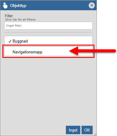 Se till att det står "Navigationsmapp" i fältet med namnet "Objekttyp". Om det står "Navigationsmapp" i fältet med namnet "Objekttyp" kan du hoppa över detta instruktionssteg och gå direkt till instruktionssteg 8. Om det inte står "Navigationsmapp" i fältet med namnet "Objekttyp" ska du byta från "Byggnad" till "Navigationsmapp". För att byta från "Byggnad" till "Navigationsmapp" gör du så här: