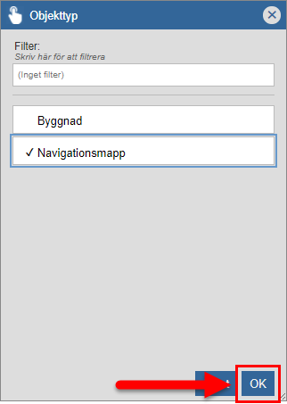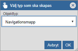 Klicka på "Navigationsmapp" (se den första bilden nedan). Avsluta sedan med att klicka "OK" (se den andra bilden nedan). När du klickar "OK" i listan med objekttyper skickas du tillbaka till dialogrutan med namnet "Välj typ som ska skapas". I dialogrutan med namnet "Välj typ som ska skapas" ser du att du angett att du vill skapa en navigationsmapp (se den tredje bilden nedan).