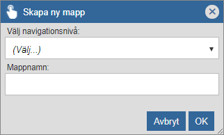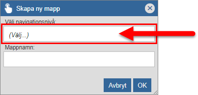 Klicka i fältet med namnet "Välj navigationsnivå" (se den första bilden nedan). När du klickar i fältet med namnet "Välj navigationsnivå" får du tillgång till en lista med navigationsnivåer. I listan med navigationsnivåer hittar du de navigationsnivåer du kan sätta på den navigationsmapp du ska lägga till i det navigationsträd du skapat (se den andra bilden nedan).