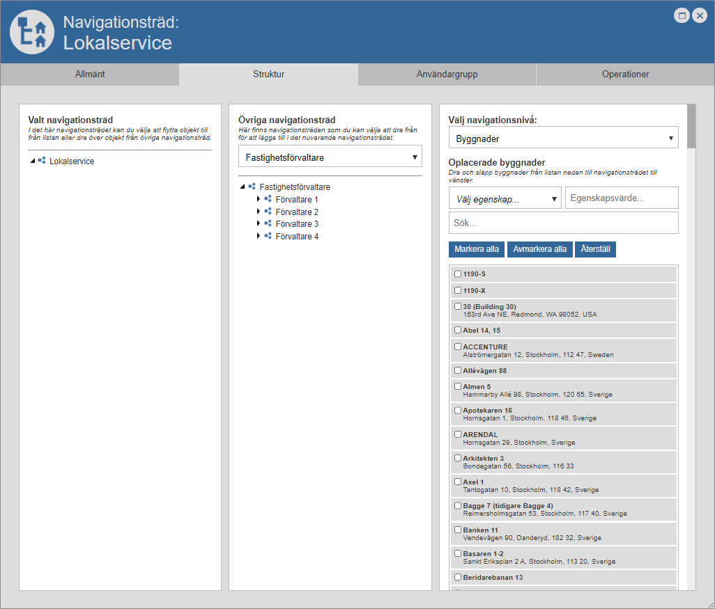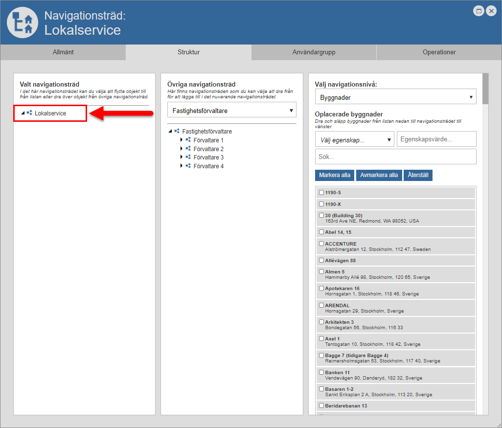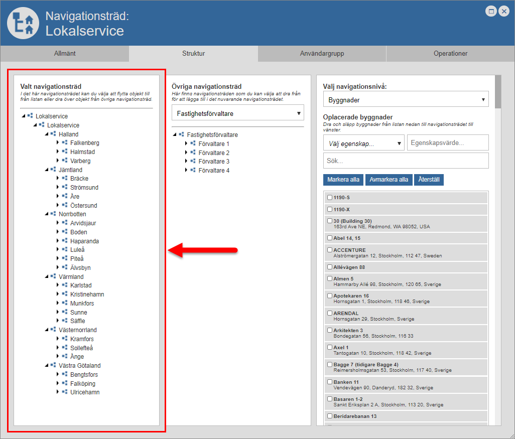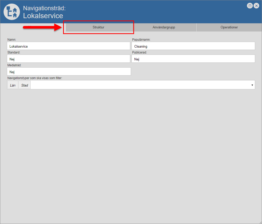 Ställ dig på fliken med namnet "Struktur" (se den första bilden nedan). Detta om du inte redan står på den aktuella fliken. När du ställer dig på fliken med namnet "Struktur" får du tillgång till tre kolumner: "Valt navigationsträd", "Övriga navigationsträd" och "Välj navigationsnivå" (se den andra bilden nedan).