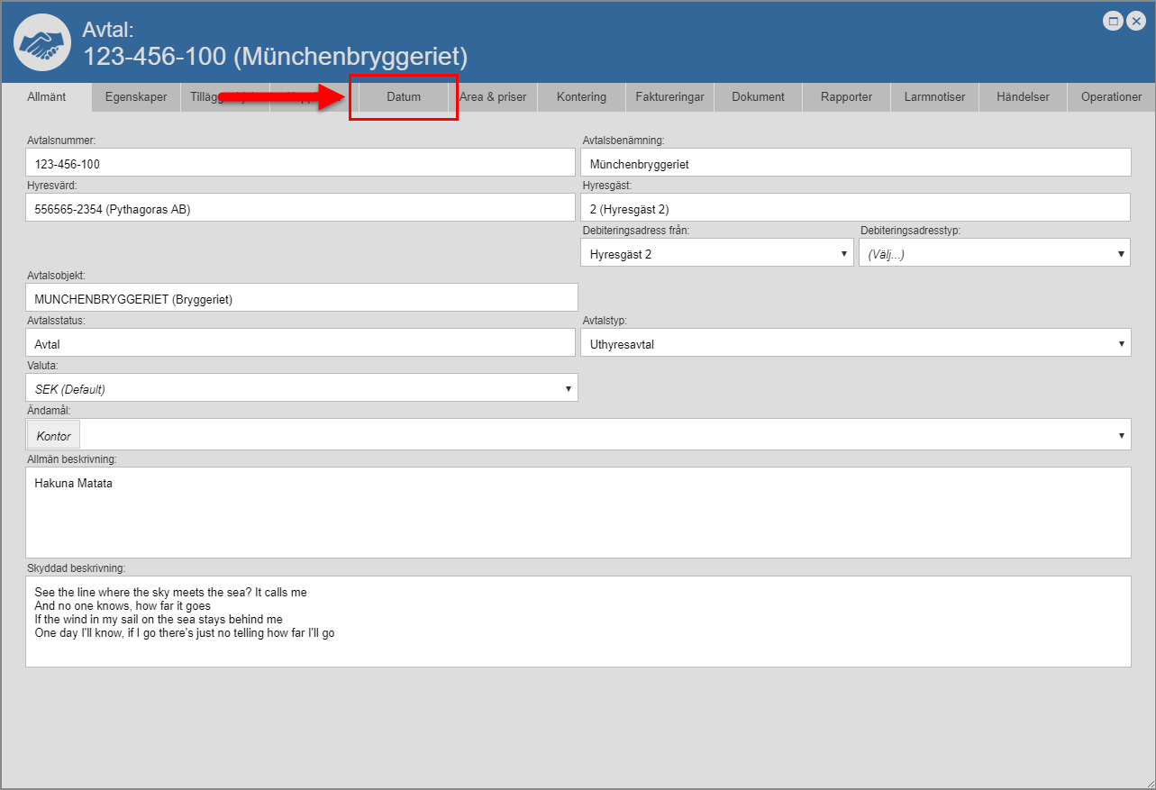 Ställ dig på fliken med namnet "Datum" (se den första bilden nedan). Detta om du inte redan står på den aktuella fliken. När du ställer dig på fliken med namnet "Datum" får du tillgång till ett antal fält och ett antal knappar (se den andra bilden nedan). Notera att en av de knappar du får tillgång till har namnet "Ny uppsägningsoption".