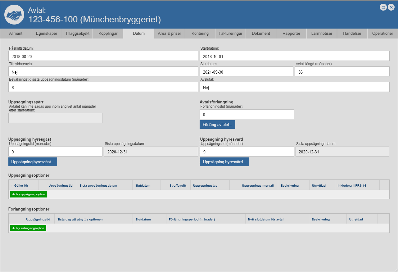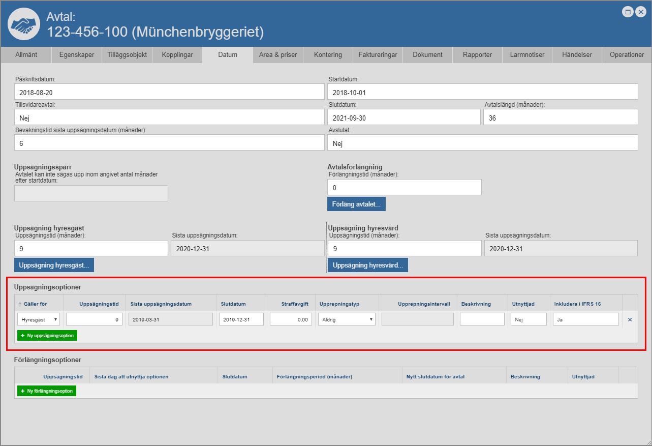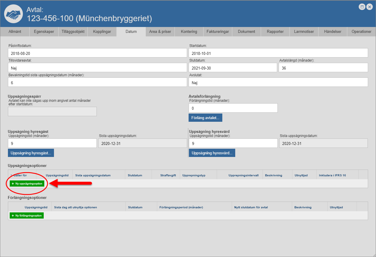 Klicka på knappen med namnet "Ny uppsägningsoption" (se den första bilden nedan). När du klickar på knappen med namnet "Ny uppsägningsoption" kommer en uppsägningsoption läggas till i det avtal du arbetar med (se den andra bilden nedan). Notera att uppsägningsoptionen består av tio fält: ett fält med namnet "Gäller för", ett fält med namnet "Uppsägningstid", ett fält med namnet "Sista uppsägningsdatum", ett fält med namnet "Slutdatum", ett fält med namnet "Straffavgift", ett fält med namnet "Upprepningstyp", ett fält med namnet "Upprepningsintervall", ett fält med namnet "Beskrivning", ett fält med namnet "Utnyttjad" och ett fält med namnet "Inkludera i IFRS 16". Via fälten ska du sätta information på den uppsägningsoption du lagt till i det avtal du arbetar med.