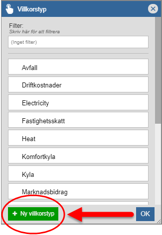 klicka på knappen med namnet "Nytt avtalsvillkor" och sedan klicka i fältet med namnet "Villkorstyp (se bilderna nedan).