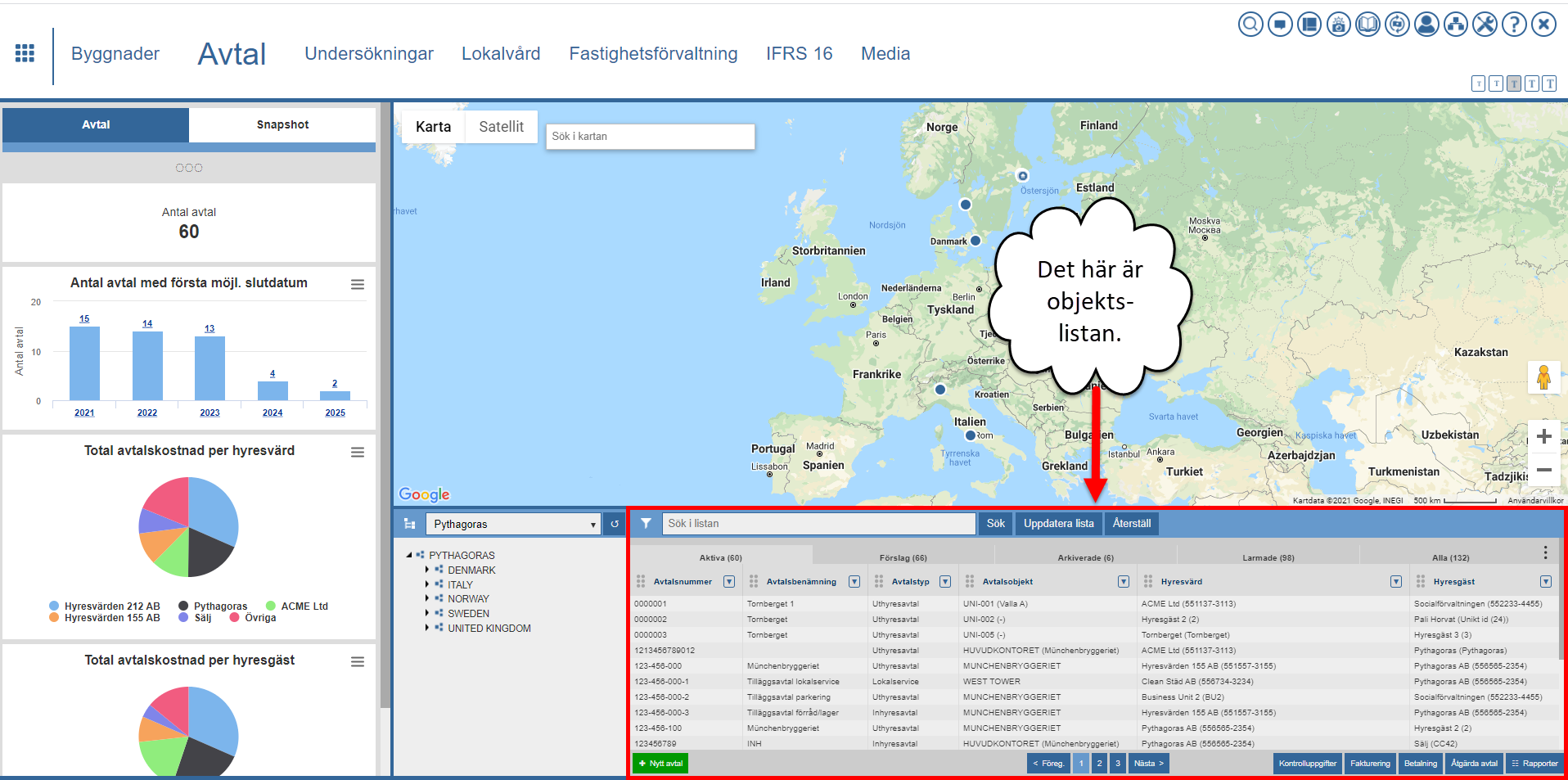 Objektslistan är placerad under kartan (se bilden nedan). I objektslistan hittar du en lista med avtal.