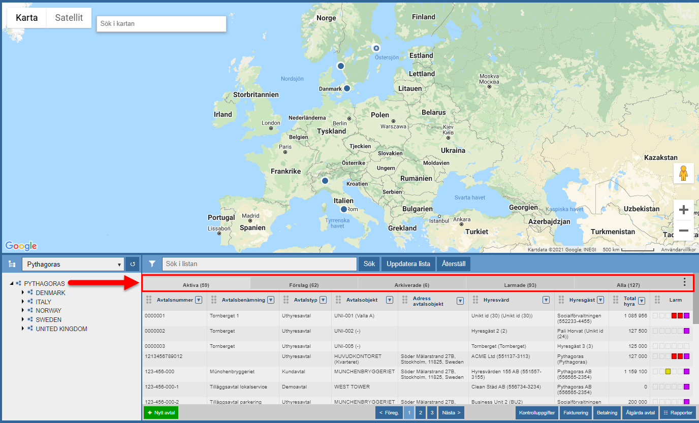I objektslistan hittar du inte bara en lista med avtal; i objektslistan hittar du också fem flikar: "Aktiva", "Förslag", "Arkiverade", "Larmade" och "Alla" (se bilden nedan). De flikar du hittar i objektslistan fungerar som filter och ger dig möjlighet att snabbt och enkelt välja vilka avtal du vill se i listan: aktiva avtal, avtalsförslag, arkiverade avtal, larmade avtal eller alla avtal (oavsett status).