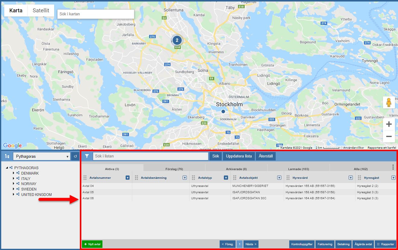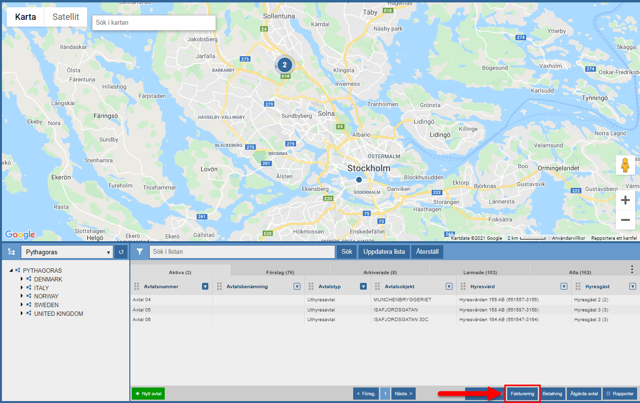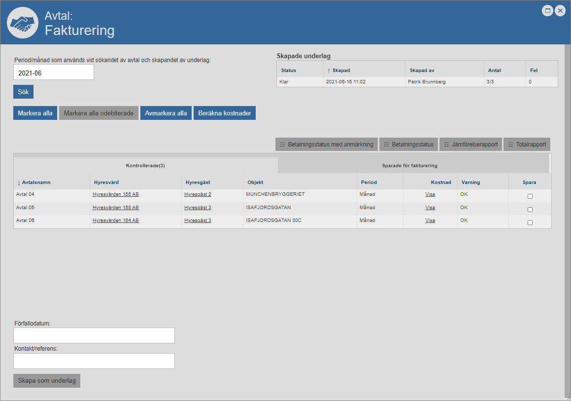 Klicka på knappen med namnet "Fakturering" (se den första bilden nedan). När du klickar på knappen med namnet "Fakturering" kommer faktureringsfönstret att öppnas. I faktureringsfönstret hittar du en avtalslista som innehåller två flikar: ”Kontrollerade” och ”Sparade för fakturering”. (se den andra bilden nedan).