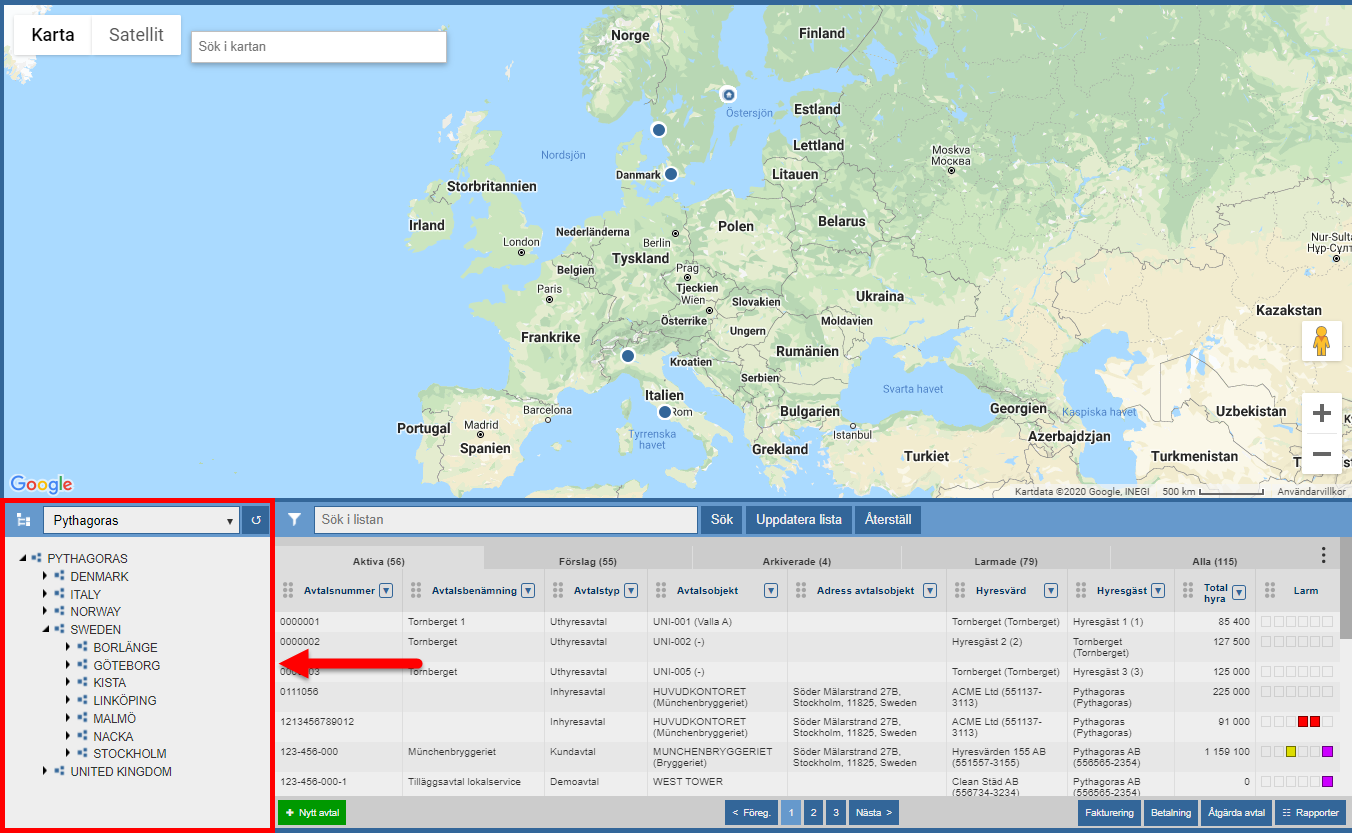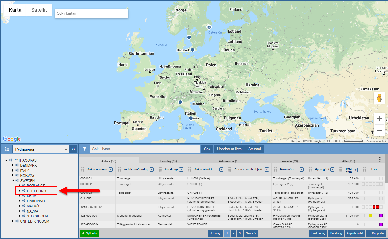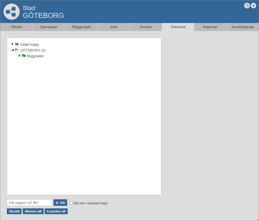 I dokumenthanteraren hittar du ett antal mappar som ligger på olika nivåer i ett dokumentträd. I dokumentträdet hittar du två huvudmappar: en delad mapp och en mapp som är specifik för den navigationsmapp du öppnat (se bilden nedan). Notera att den mapp som är specifik för den navigationsmapp du öppnat delar namn med den aktuella navigationsmappen. Om du öppnat en navigationsmapp med namnet "Göteborg" innebär detta att den specifika mappen också kommer heta "Göteborg". Oavsett hur många mappar dokumentträdet innehåller kommer de olika mapparna antingen vara kopplade till den delade mappen eller den specifika mappen. För en kort, översiktlig beskrivning av några av de saker du kommer ha möjlighet att göra när du arbetar med dokumenthanteraren på navigationsnivå, fortsätt läsa under bilden nedan.