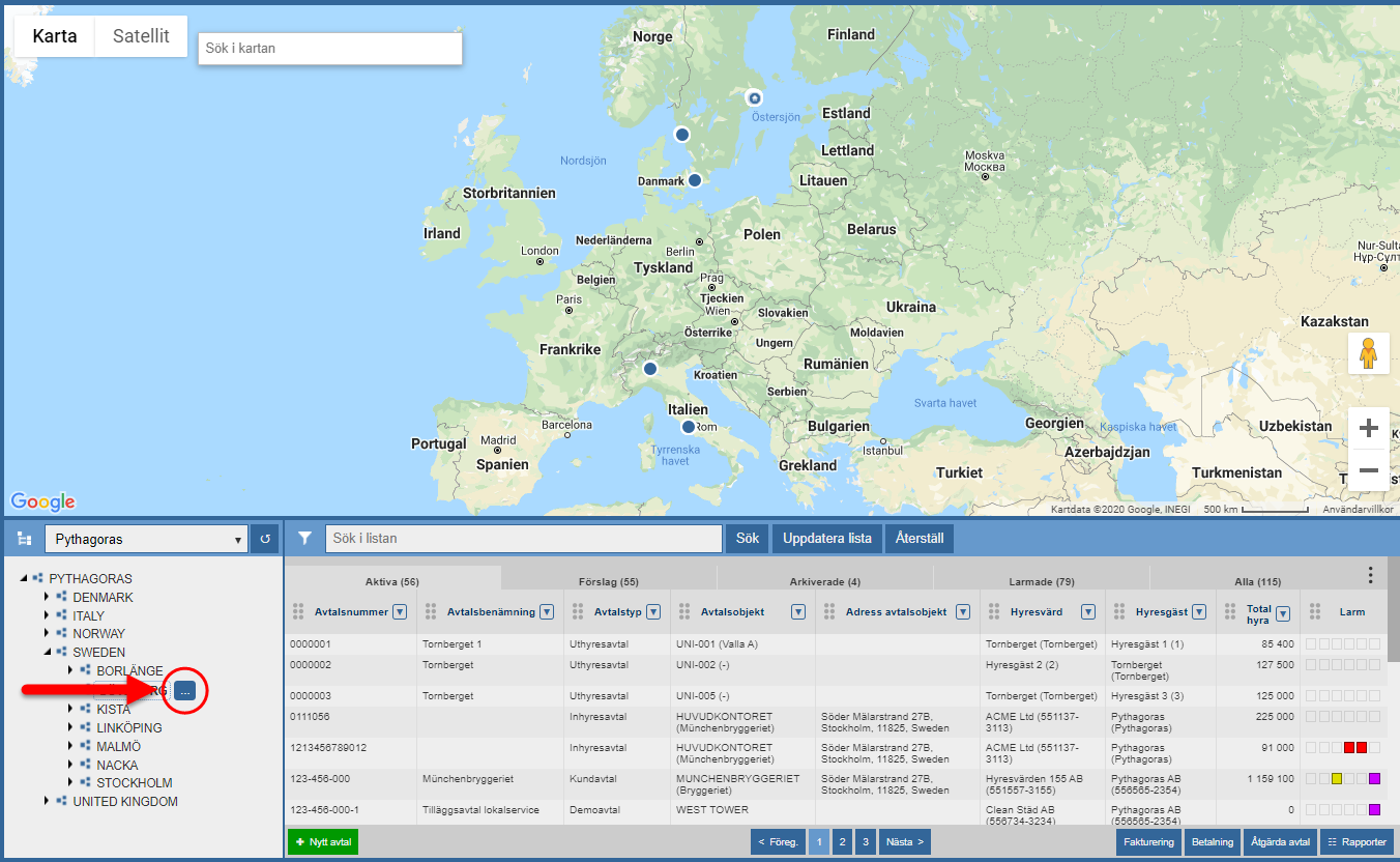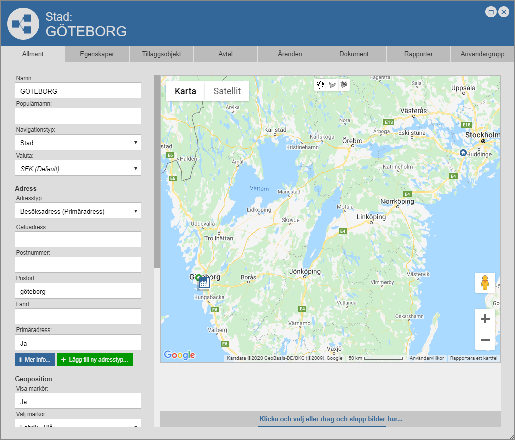 Klicka på knappen med namnet "Öppna" (se den första bilden nedan). När du klickar på knappen med namnet "Öppna" kommer den navigationsmapp du placerat din muspekare på, att öppnas. När en navigationsmapp öppnas får du tillgång till navigationsmappens navigationskort. I navigationskortet hittar du åtta flikar: "Allmänt", "Egenskaper", "Tilläggsobjekt", "Avtal", "Ärenden", "Dokument", "Rapporter" och "Användargrupp" (se den andra bilden nedan).