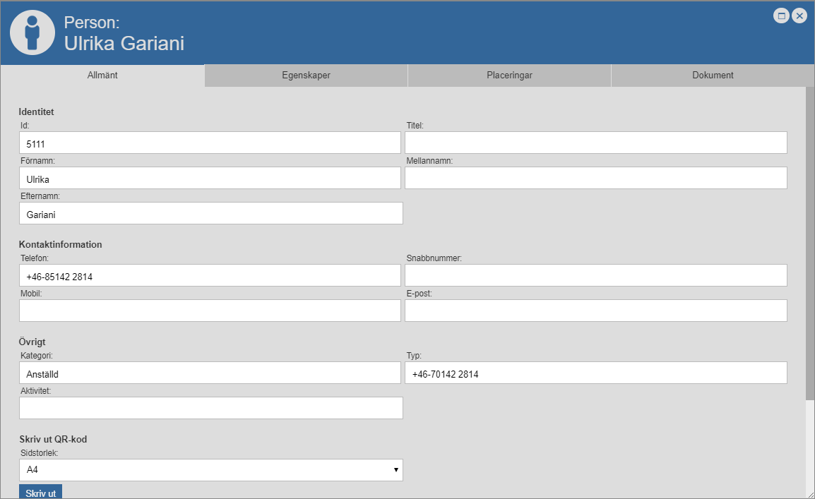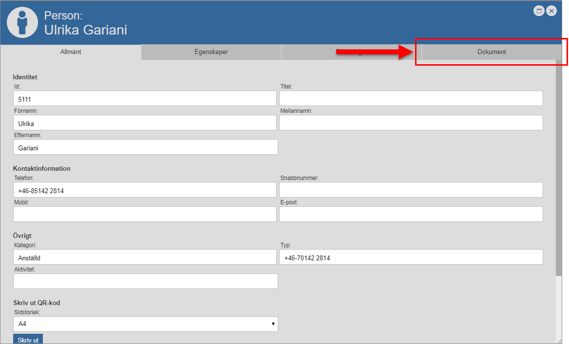 Klicka på den person du vill nå dokumenthanteraren via (se den första bilden nedan). När du klickar på en person får du tillgång till personens personkort (se den andra bilden nedan). I personkortet hittar du fyra flikar: "Allmänt", "Egenskaper", "Placeringar" och "Dokument".