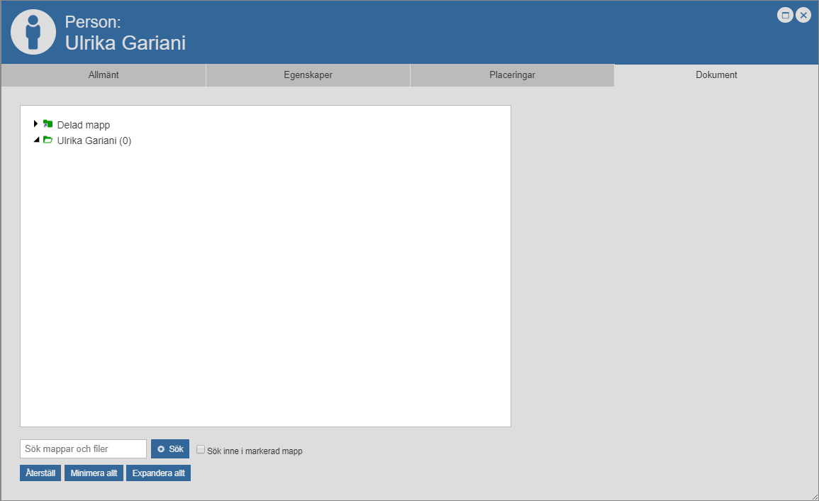 I dokumenthanteraren hittar du ett antal mappar som ligger på olika nivåer i ett dokumentträd. I dokumentträdet hittar du två huvudmappar: en delad mapp och en mapp som är specifik för den person vars personkort du öppnat (se bilden nedan). Notera att den mapp som är specifik för den person vars personkort du öppnat delar namn med den aktuella personen. Om du öppnat Ulrika Garianis personkort innebär detta att dokumenthanterarens personspecifika mapp kommer heta "Ulrika Gariani". Oavsett hur många mappar dokumentträdet innehåller kommer de olika mapparna antingen vara kopplade till den delade mappen eller personspecifika mappen. För en kort, översiktlig beskrivning av några av de saker du har möjlighet att göra när du arbetar med dokumenthanteraren på personnivå, fortsätt läsa under bilden nedan.
