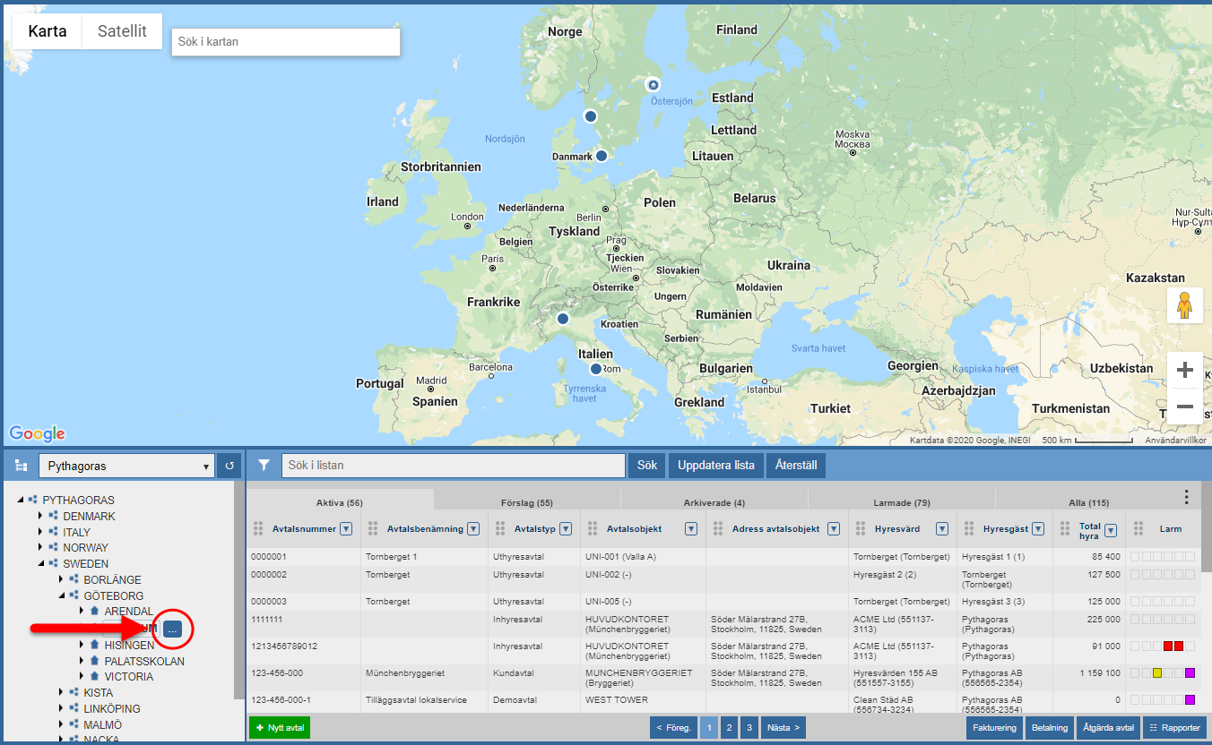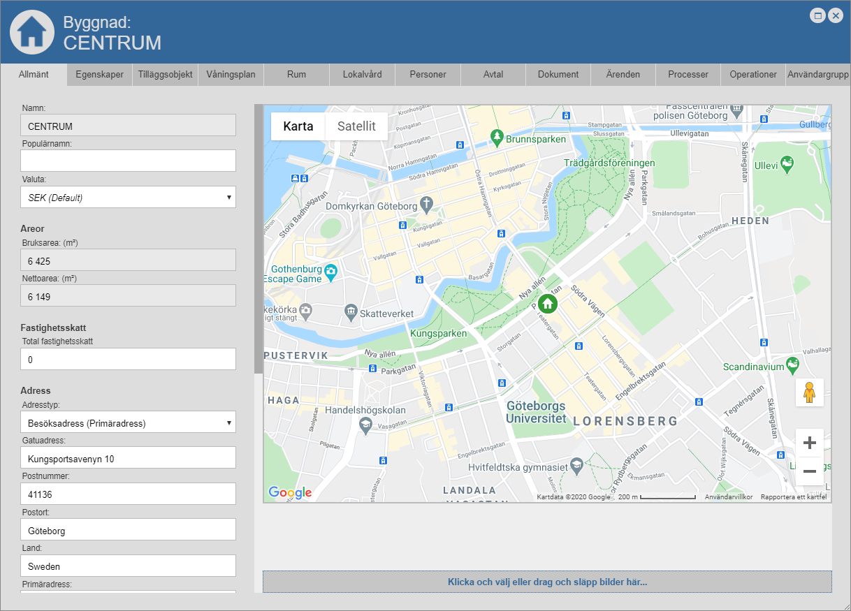 Klicka på knappen med namnet "Öppna" (se den första bilden nedan). När du klickar på knappen med namnet "Öppna" kommer den byggnad du placerat din muspekare på att öppnas. När en byggnad öppnas får du tillgång till byggnadens byggnadskort (se den andra bilden nedan). I byggnadskortet hittar du tretton flikar: "Allmänt", "Egenskaper", "Tilläggsobjekt", "Våningsplan", "Rum", "Lokalvård", "Personer", "Avtal",
