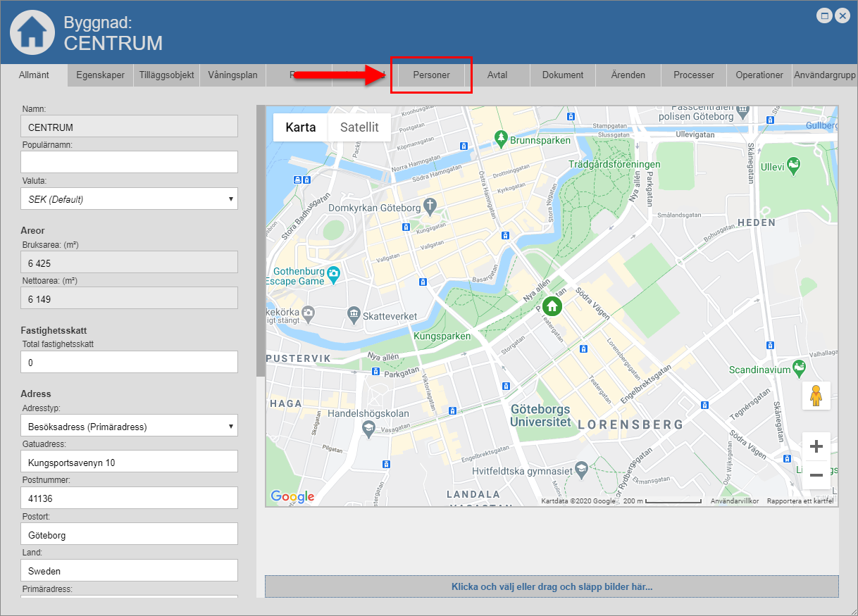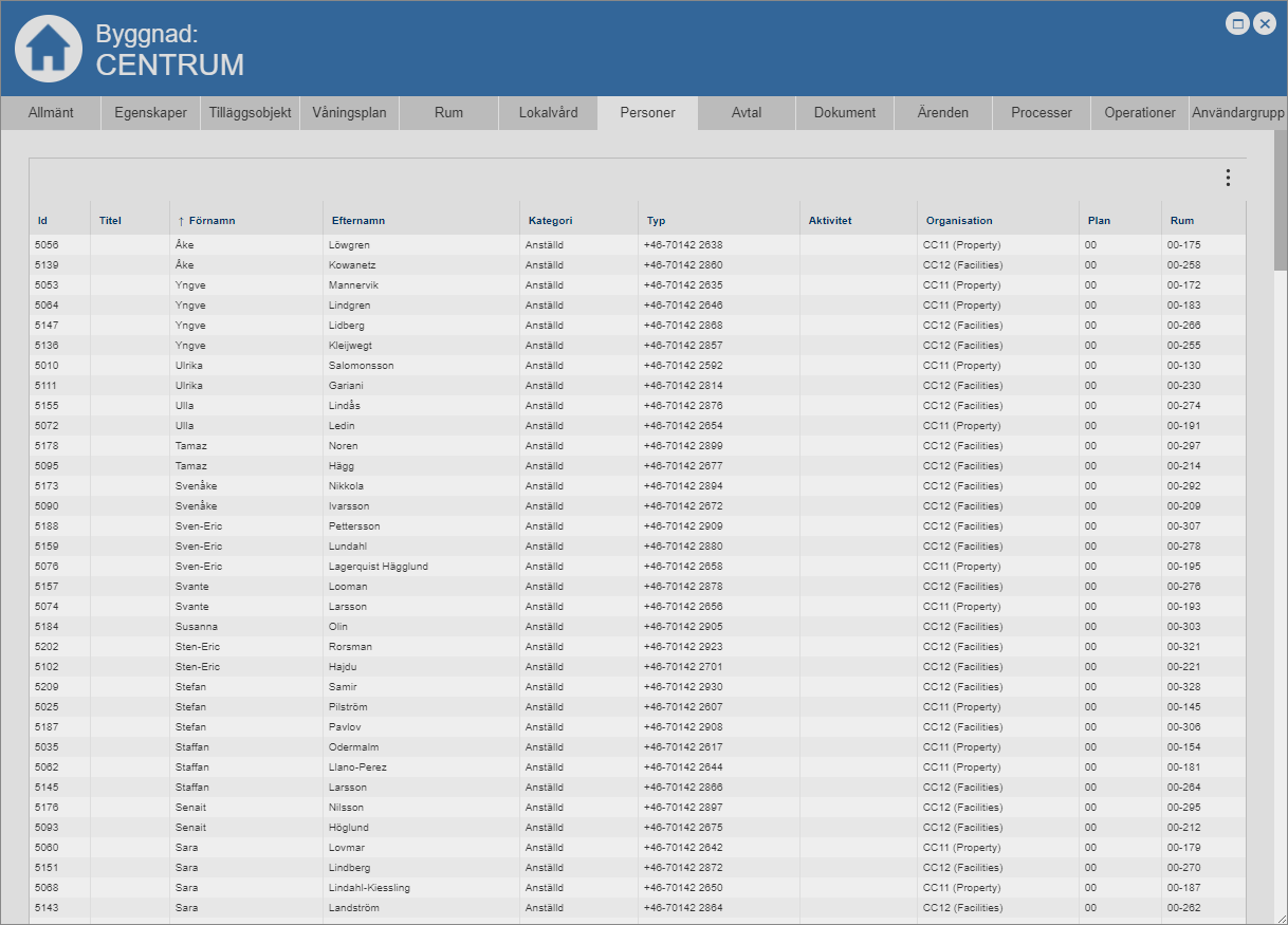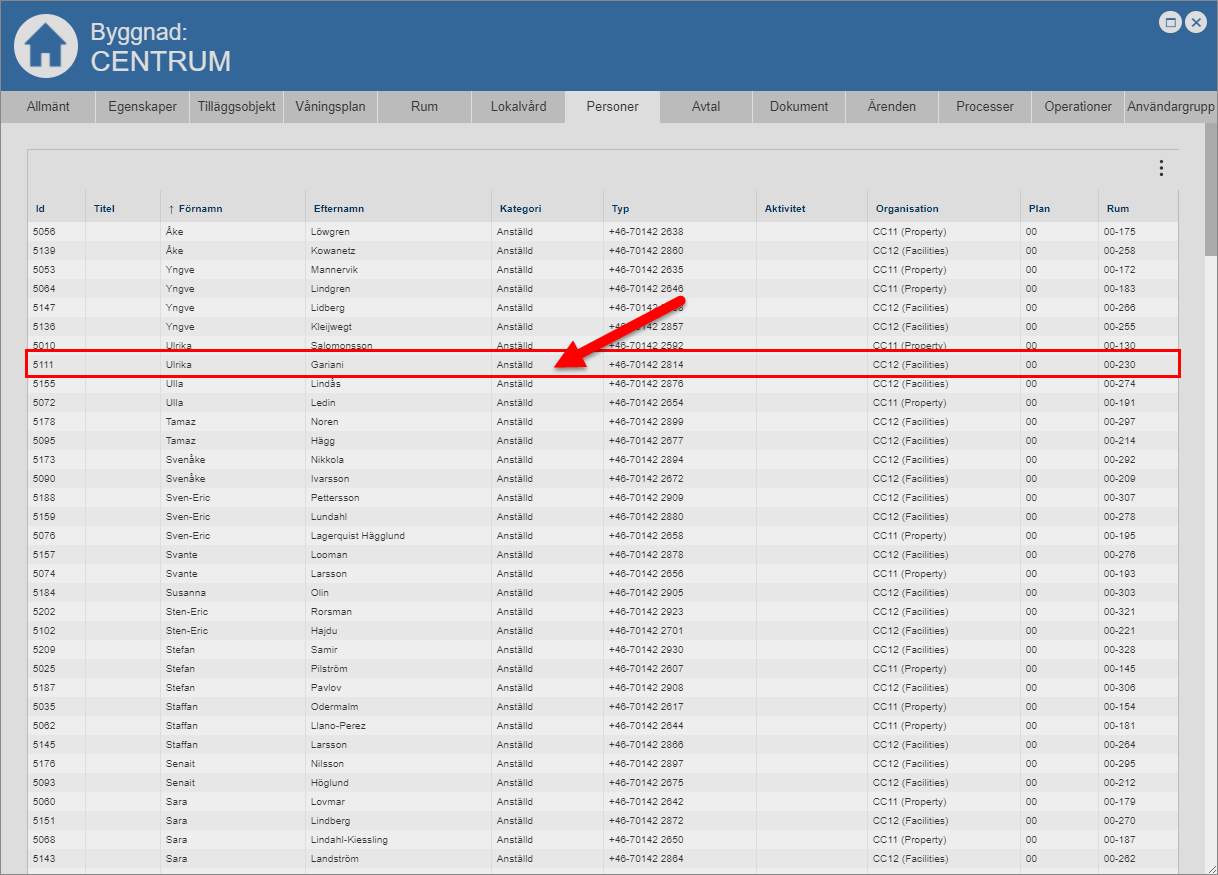 Ställ dig på fliken med namnet "Personer" (se den första bilden nedan). När du ställer dig på fliken med namnet "Personer" får du tillgång till en lista med personer som är placerade i den byggnad du öppnat (se den andra bilden nedan).