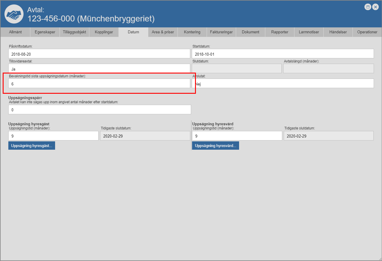 klicka "OK" (se den andra bilden nedan). När du klickar "OK" i dialogrutan med namnet "Bevakningstid sista uppsägningsdatum" skickas du tillbaka till avtalskortet. I avtalskortet ser du att den bevakningstid du angav i dialogrutan med namnet "Bevakningstid sista uppsägningsdatum" har satts på det avtal du arbetar med (se den andra bilden nedan).