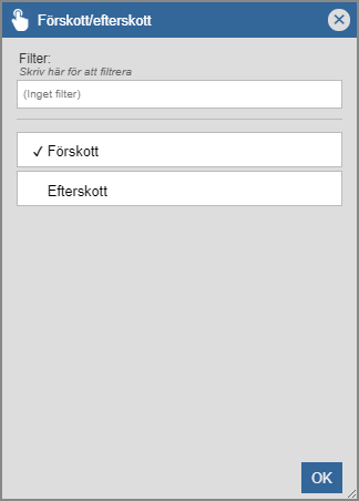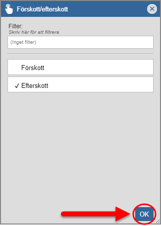 Klicka i fältet med namnet "Förskott/efterskott" (se den första bilden nedan). När du klickar i fältet med namnet "Förskott/efterskott" får du tillgång till en lista med namnet "Förskott/efterskott" (se den andra bilden nedan).