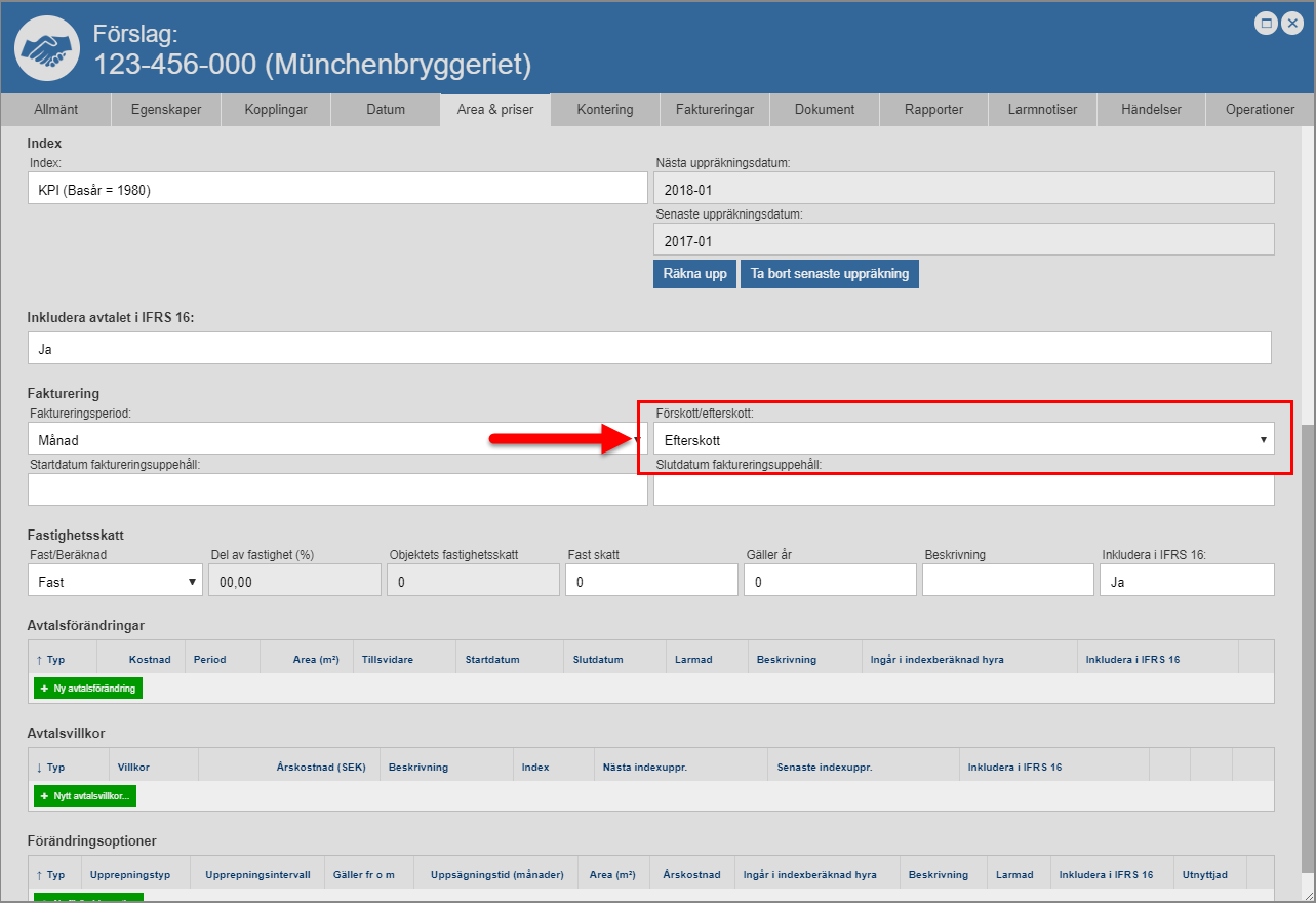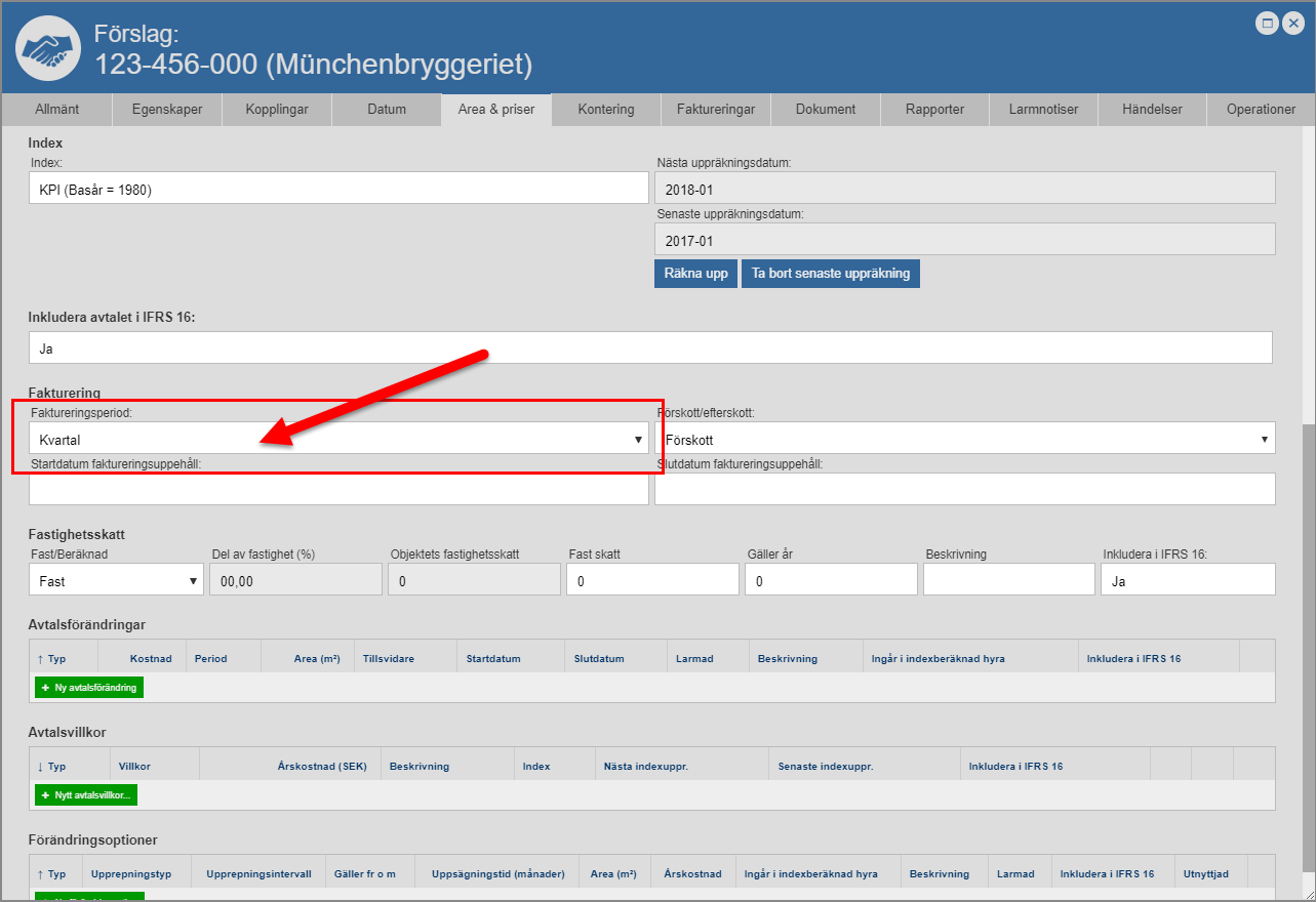 Ställ dig på fliken med namnet "Area & priser" (se den första bilden nedan). Detta om du inte redan står på den aktuella fliken. När du ställer dig på fliken med namnet "Area & priser" får du tillgång till ett antal fält och ett antal knappar (se den andra bilden nedan). Notera att två av de fält du får tillgång till har namnen "Faktureringsperiod" och "Förskott/efterskott". Notera också att du får scrolla ner i avtalskortet för att hitta fälten.