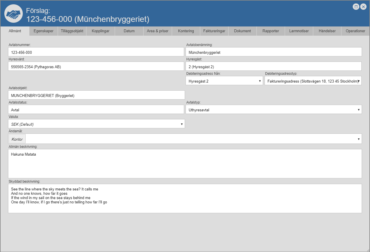 Ställ dig på fliken med namnet "Area & priser" (se den första bilden nedan). Detta om du inte redan står på den aktuella fliken. När du ställer dig på fliken med namnet "Area & priser" får du tillgång till ett antal fält och ett antal knappar (se den andra bilden nedan). Notera att ett av de fält du får tillgång till har namnet "Fast/beräknad". Notera också att du får scrolla ner i avtalskortet för att hitta fältet.