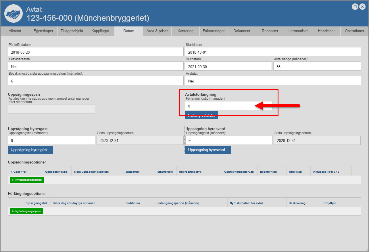 ange en förlängningstid för det avtal du arbetar med (se bilden nedan)