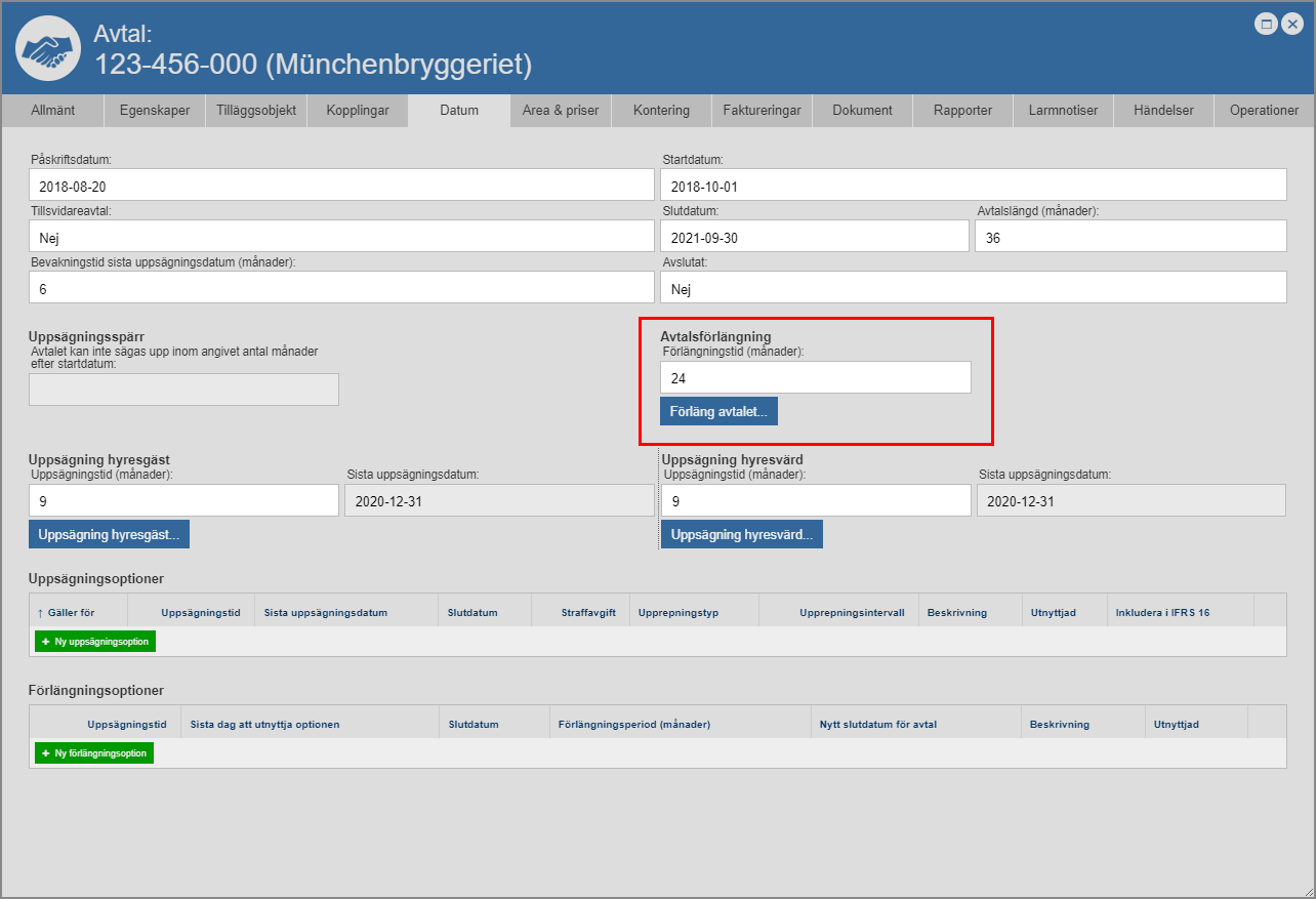 klicka "OK" (se den första bilden nedan). När du klickar "OK" i dialogrutan med namnet "Förlängningstid" skickas du tillbaka till avtalskortet. I avtalskortet ser du att den förlängningstid du angav i dialogrutan med namnet "Förlängningstid" har satts på det avtal du arbetar med (se den andra bilden nedan).